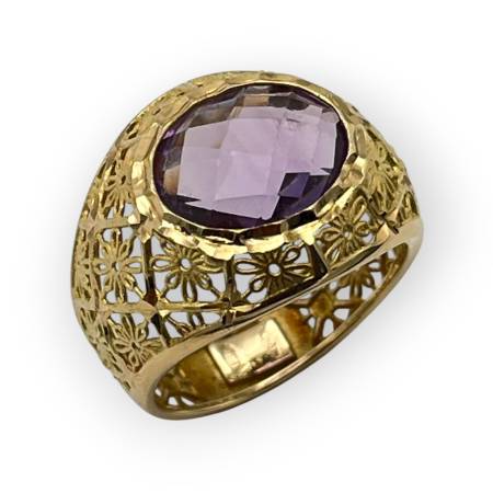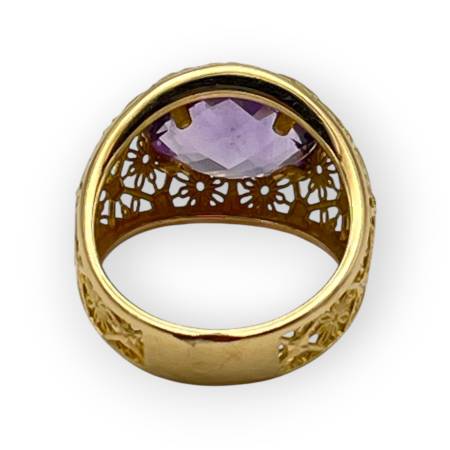 Une magnifique améthyste ovale horizontale et facettée est mise en valeur sur une très jolie monture en or jaune 18 carats (750/1000) tout en filigrane.