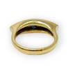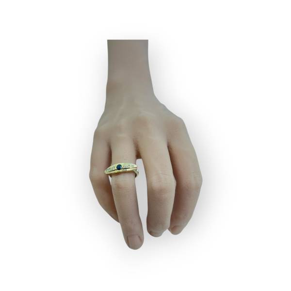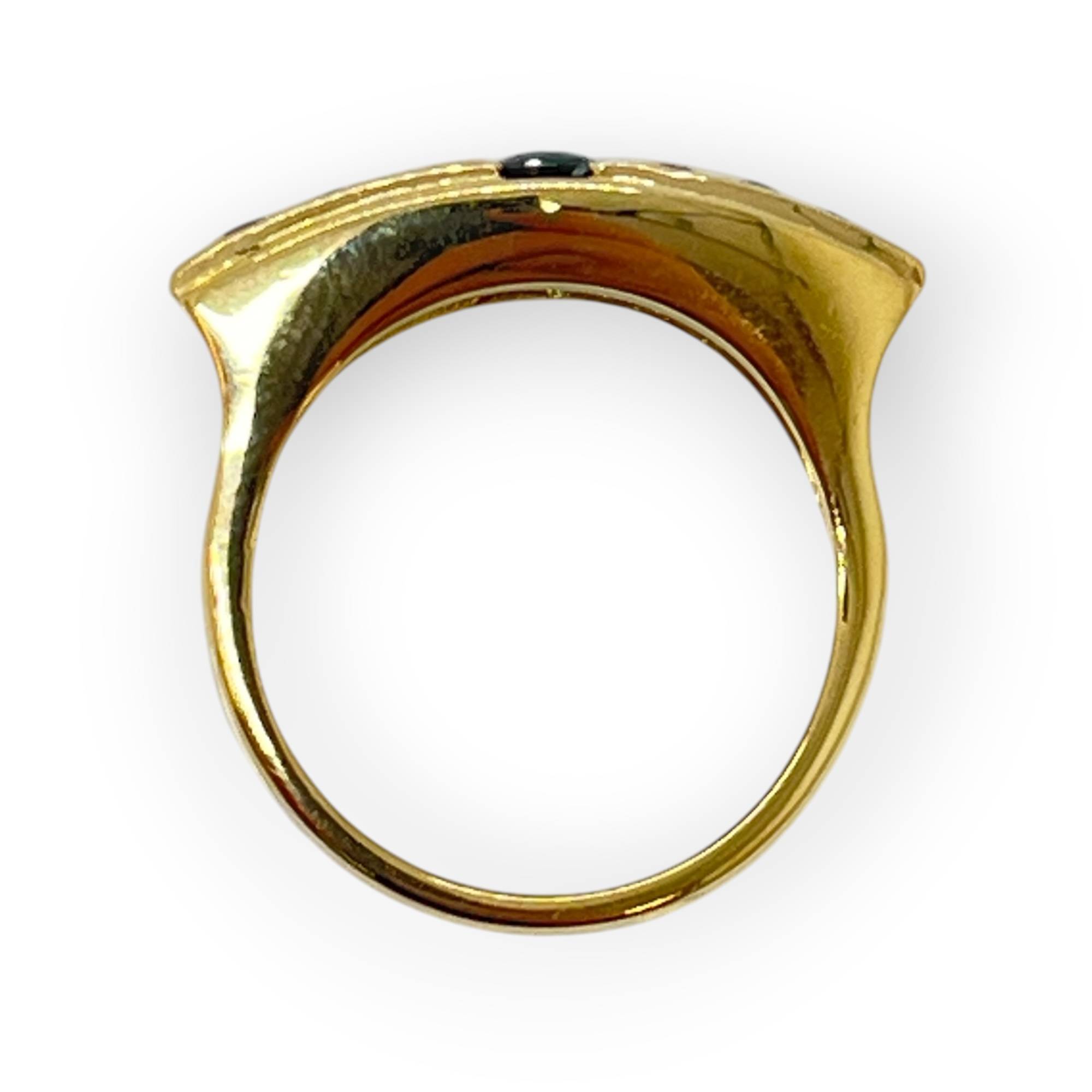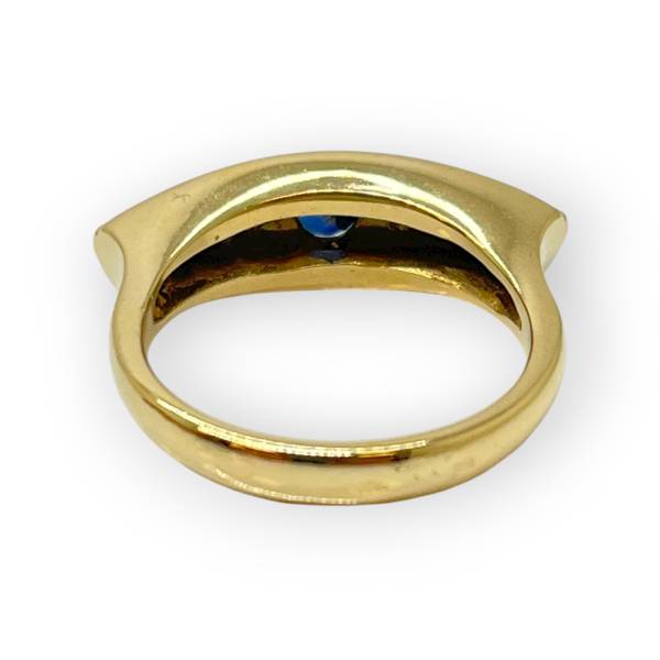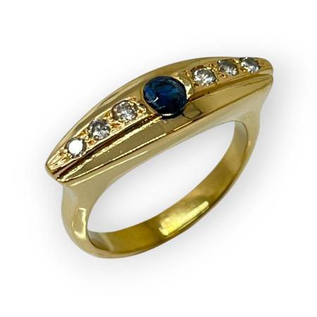 Magnifique , cette bague en or 750/1000 vintage avec une forme originale et sertie de 7 diamants et un saphir central.