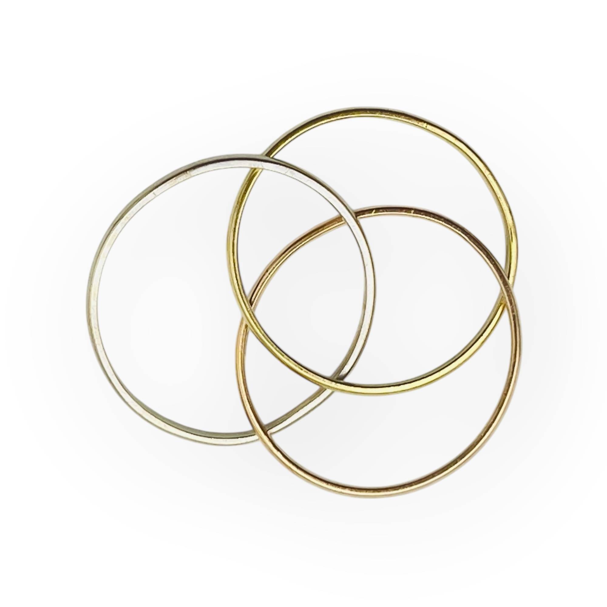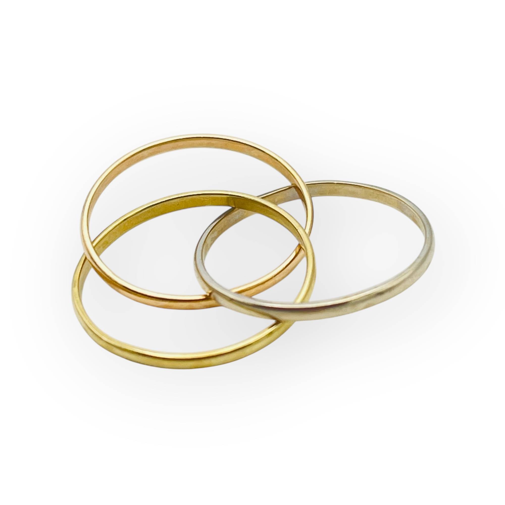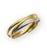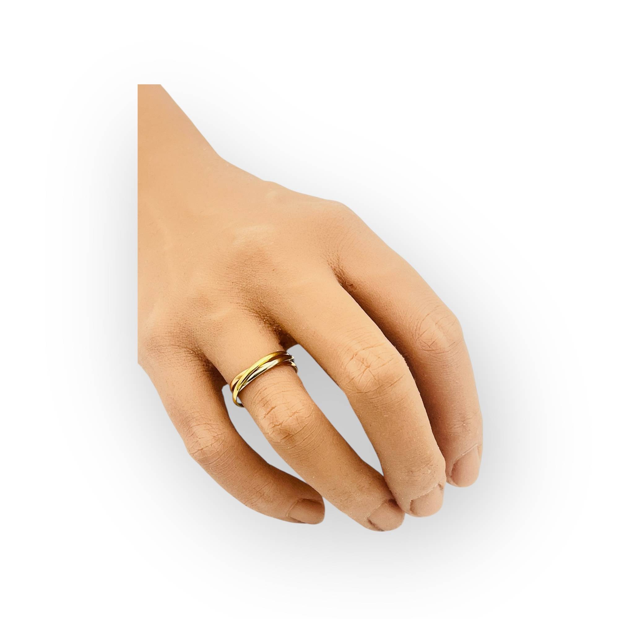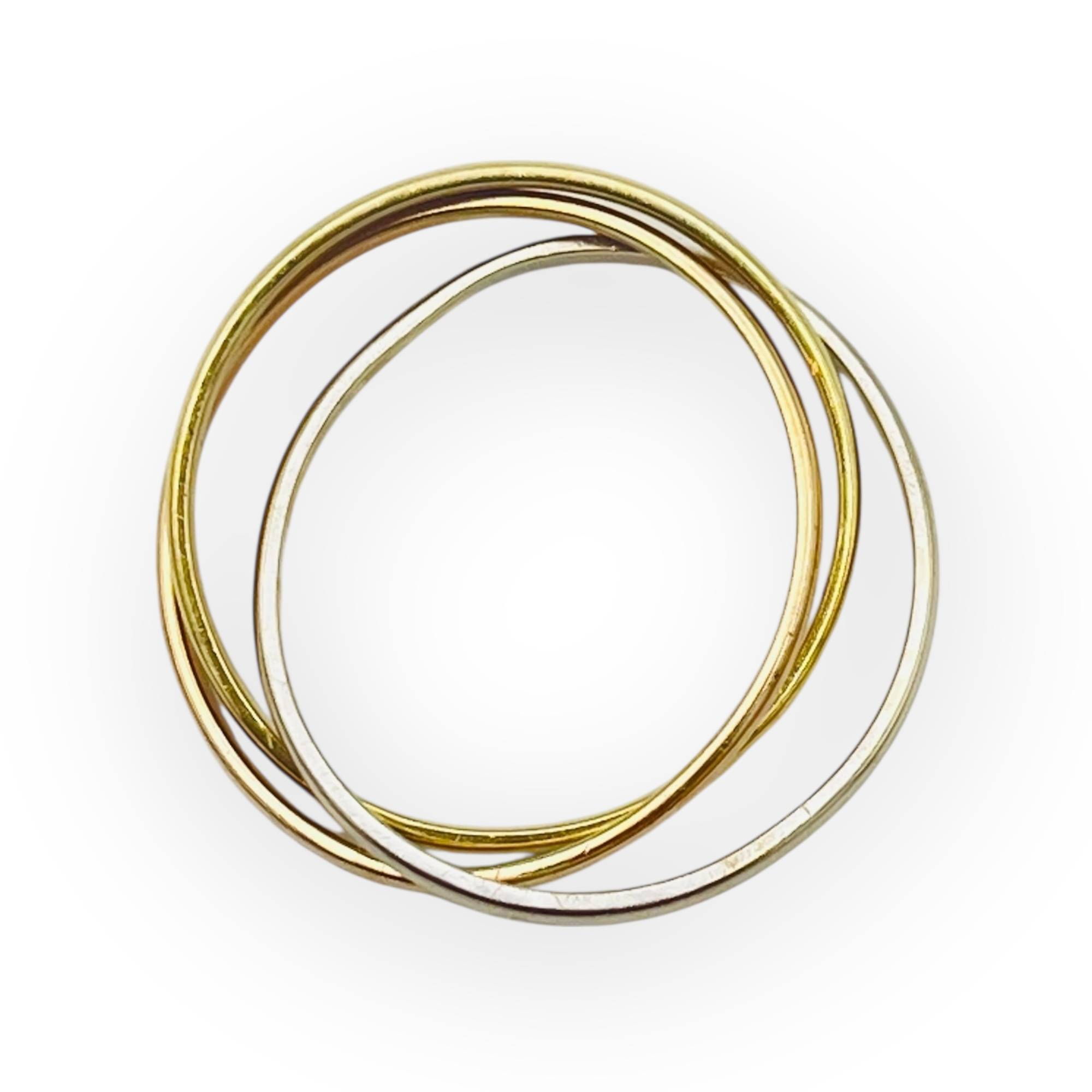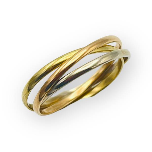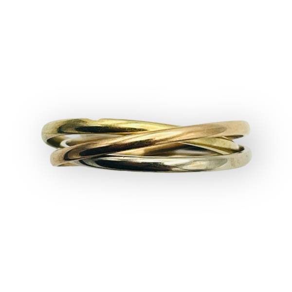 Une jolie bague trois ors 750/1000 constituée de trois anneaux entrelacés.