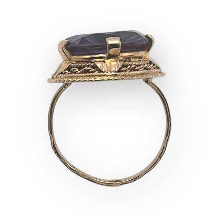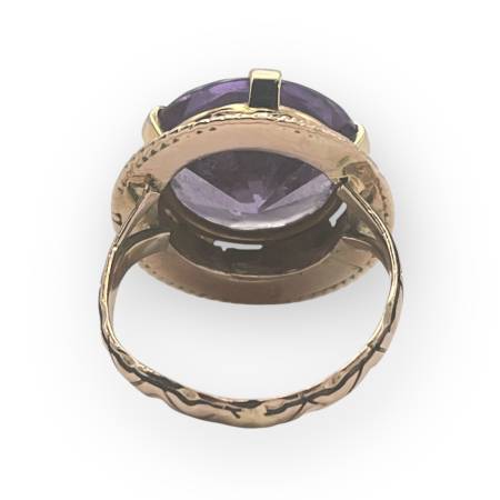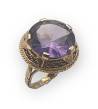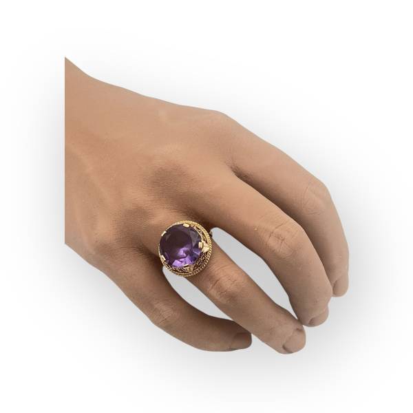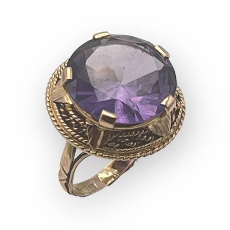 Superbe bague or 585/1000 travaillée en filigrane sertie d'une améthyste ronde facettée entourée de 5 griffes.
