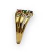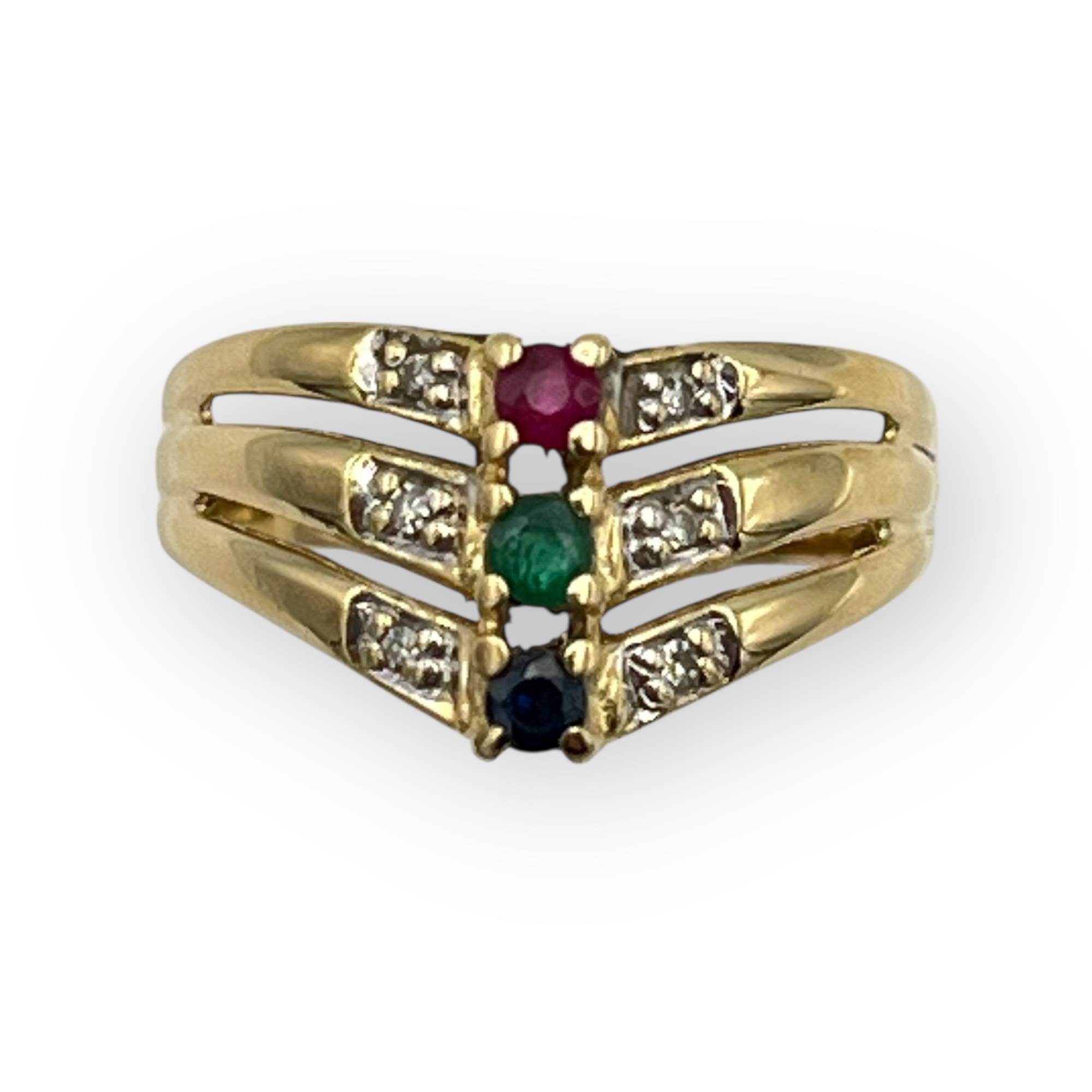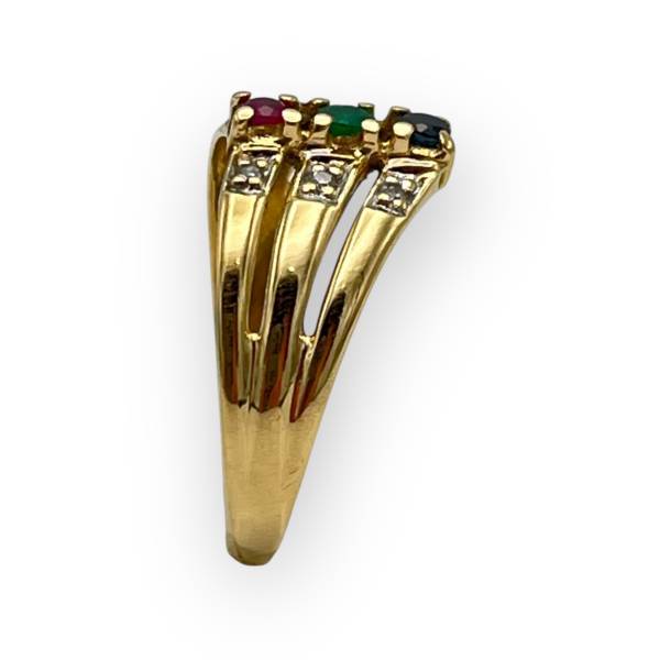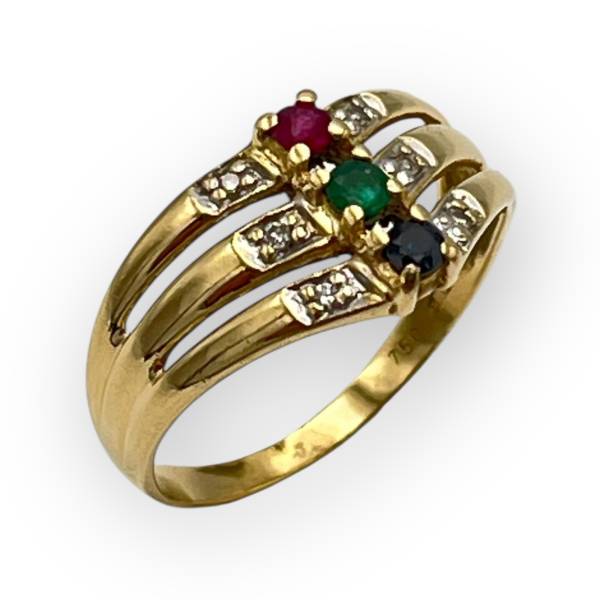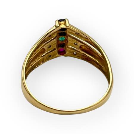Une magnifique bague en or 750/1000 sertie de 9 pierres précieuses : 6 diamants , un saphir, un rubis et une émeraude.