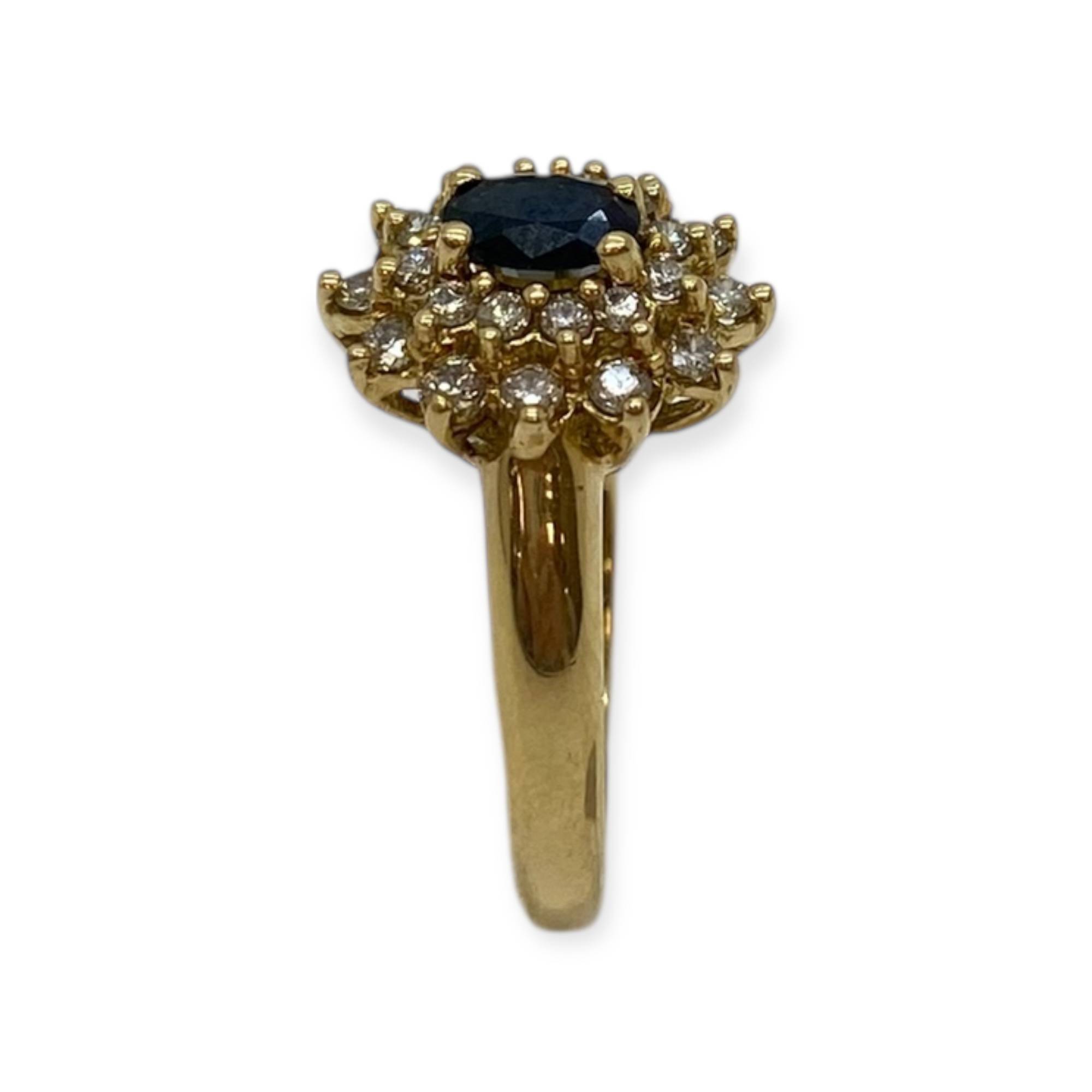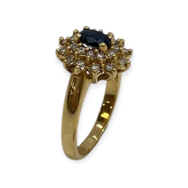 Bague en or 750/1000 (18k), ornée d’un saphir central à la teinte profonde, délicatement entouré de diamants étincelants. Une création élégante, symbole de raffinement et d’intemporalité.