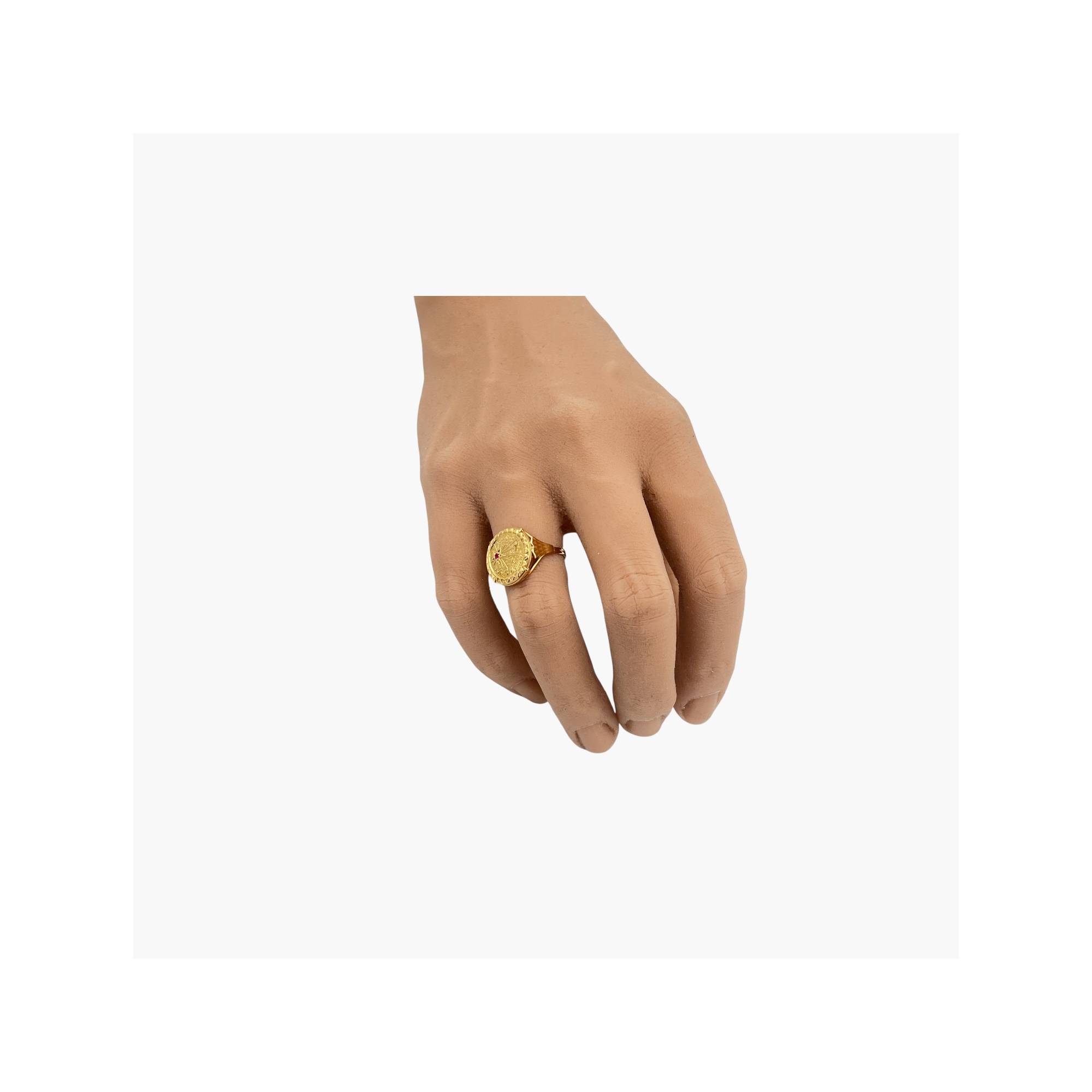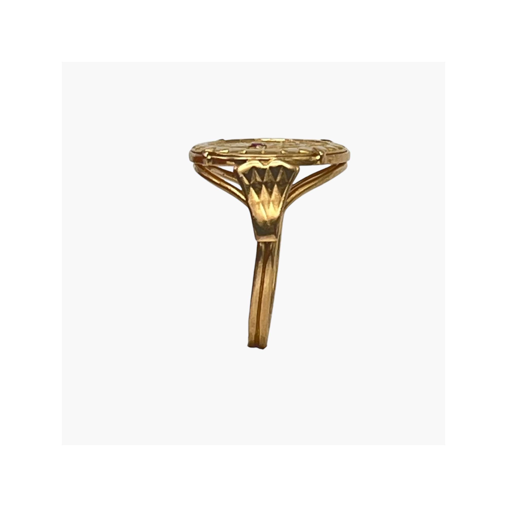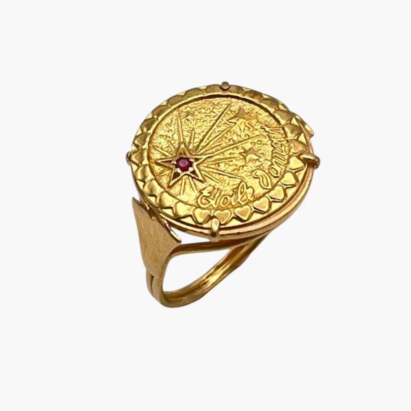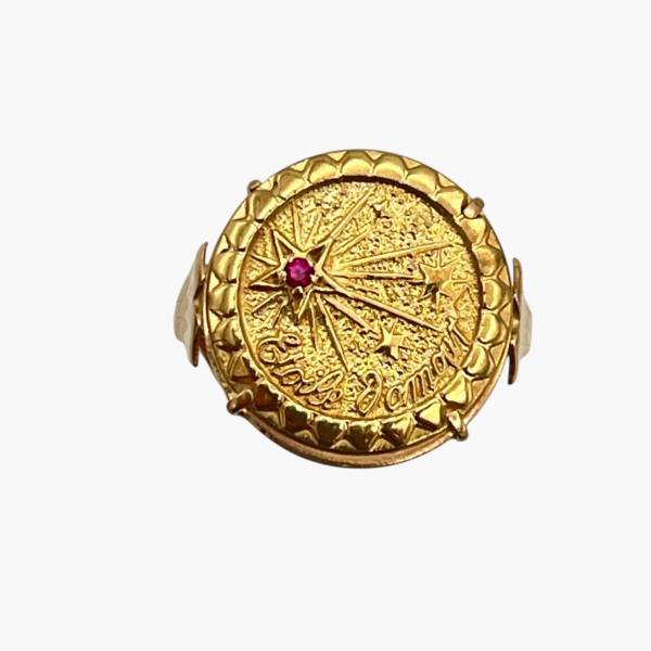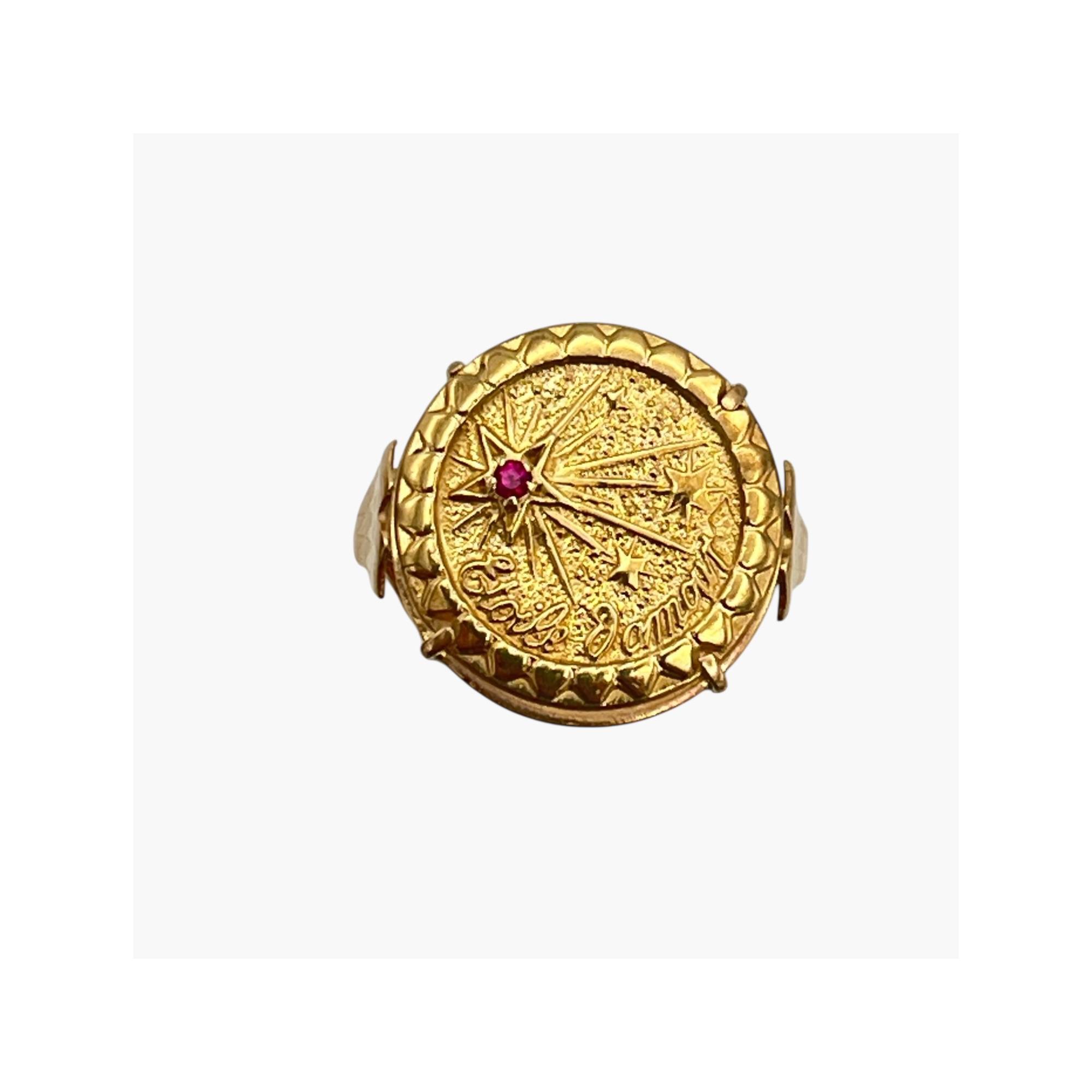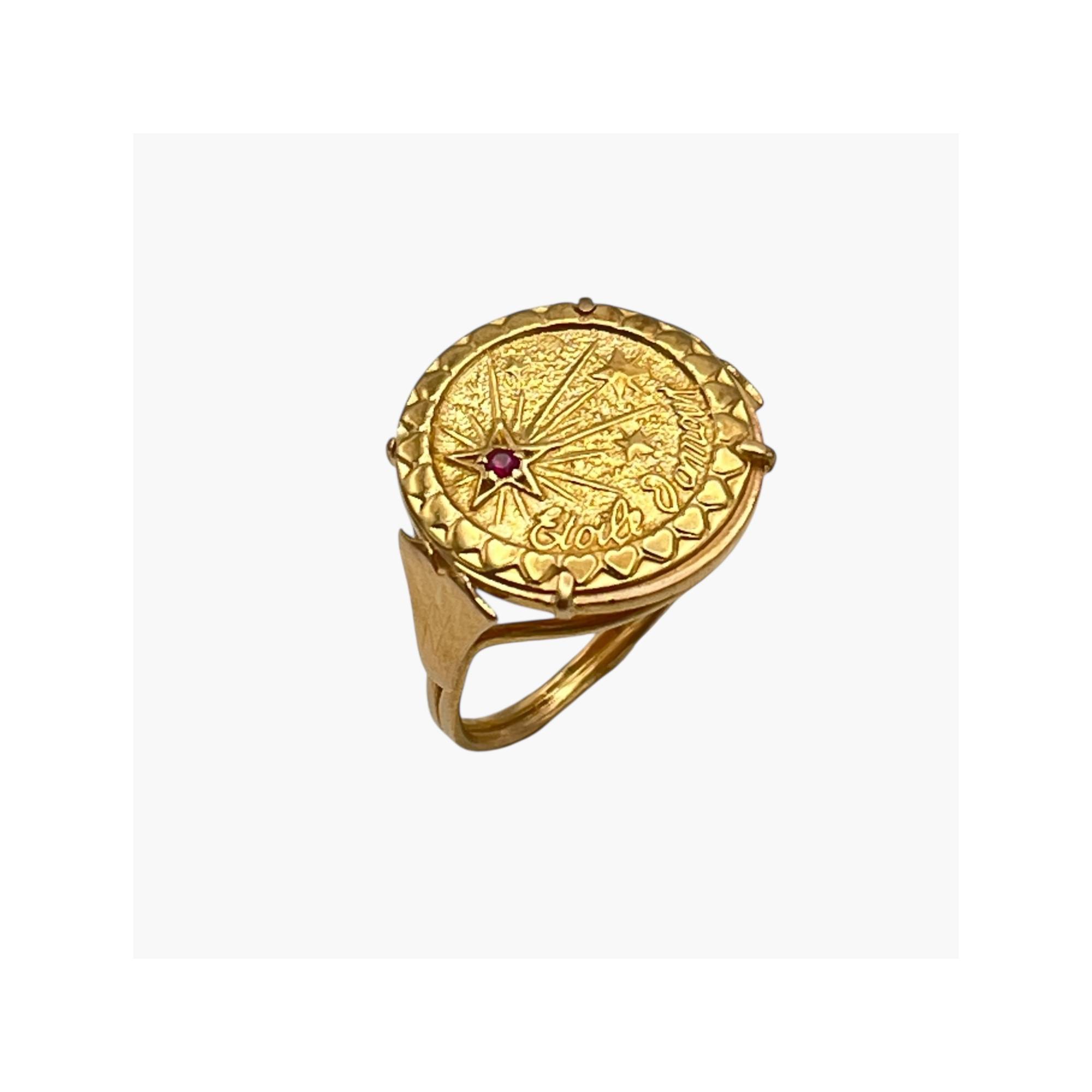 Voici une magnifique bague Vintage en or 750/1000 représentant une étoile scintillante avec en son centre un rubis et l'inscription "Etoile d'Amour" !