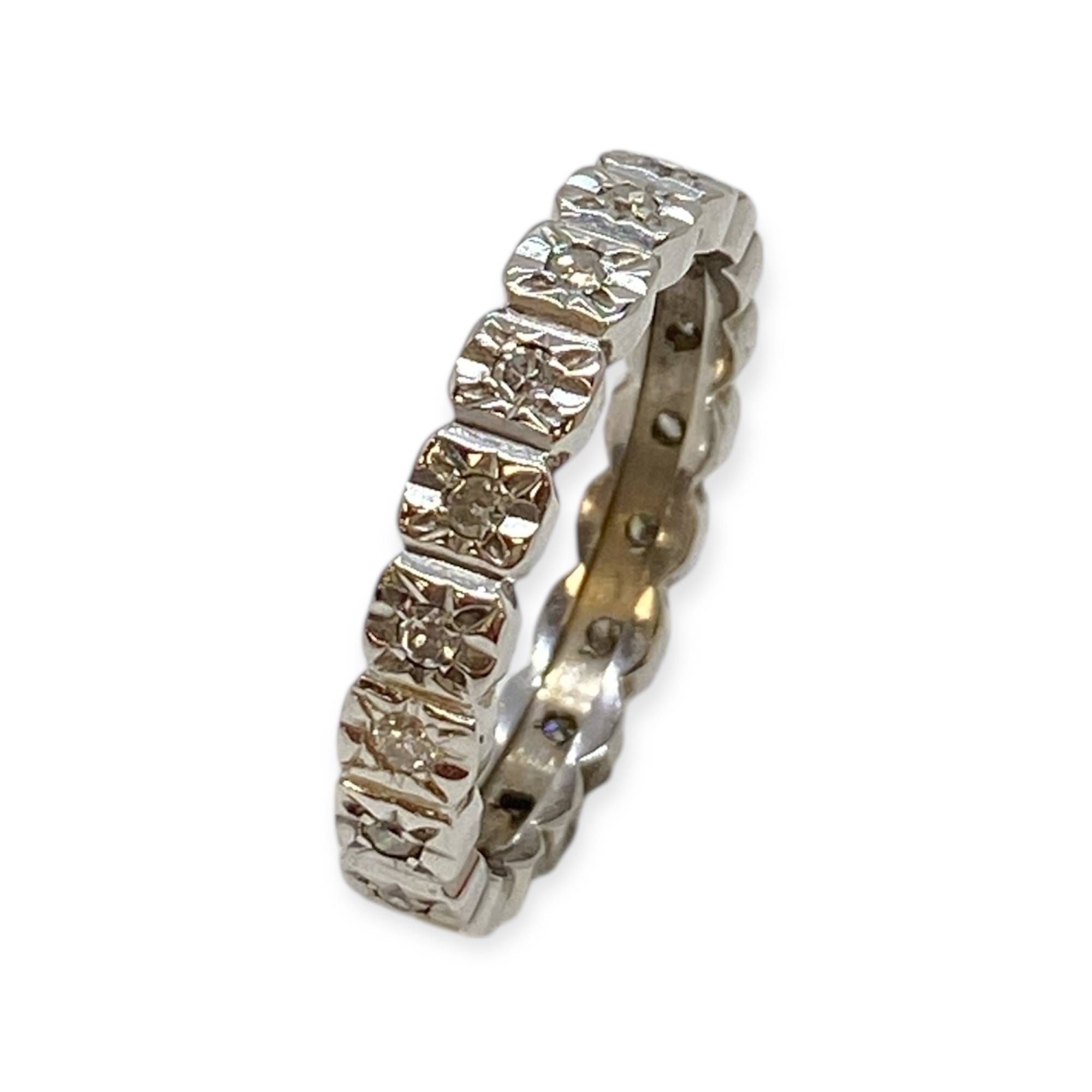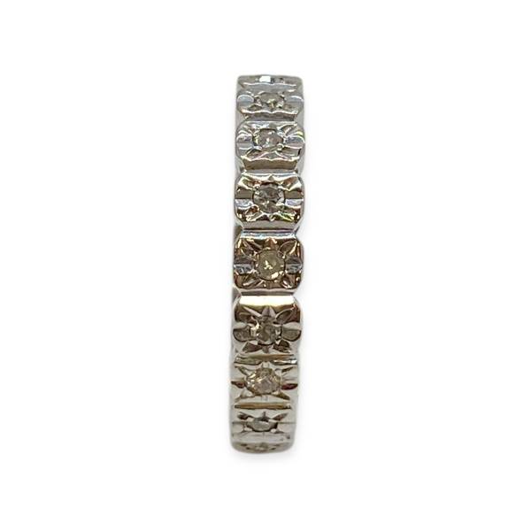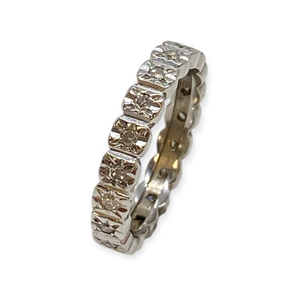 Magnifique alliance en or blanc 750/1000 (18K) ornée de diamants tout son tour.