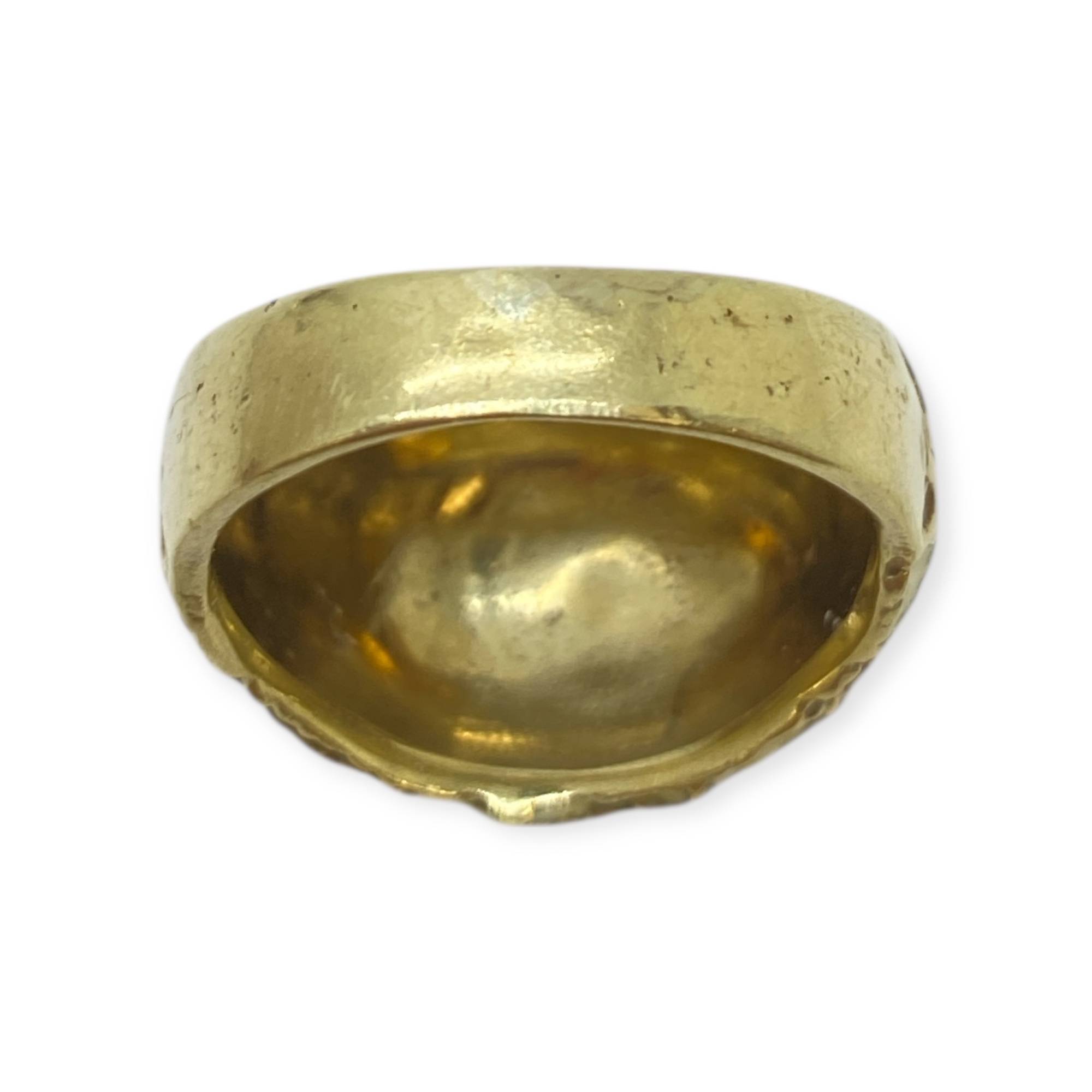 Apportez une touche d’élégance vintage à votre collection avec cette somptueuse bague en or 14 carats. Son design bombé unique est orné d’un délicat motif mosaïque en émail crème et brun foncé, subtilement délimité par des reliefs en or texturé. Chaque section émaillée évoque un patchwork raffiné, conférant à cette pièce un caractère artistique et intemporel.