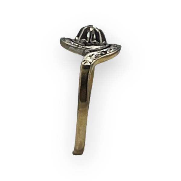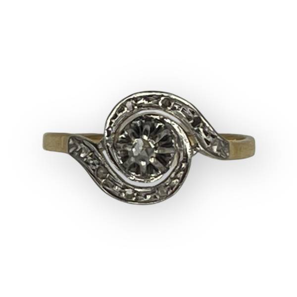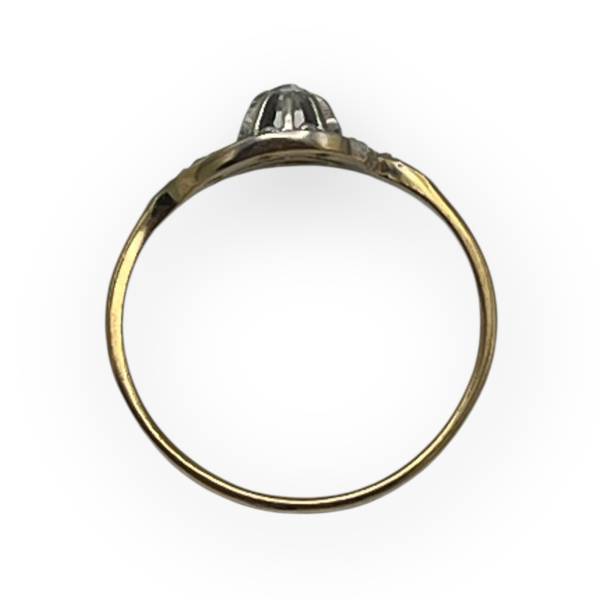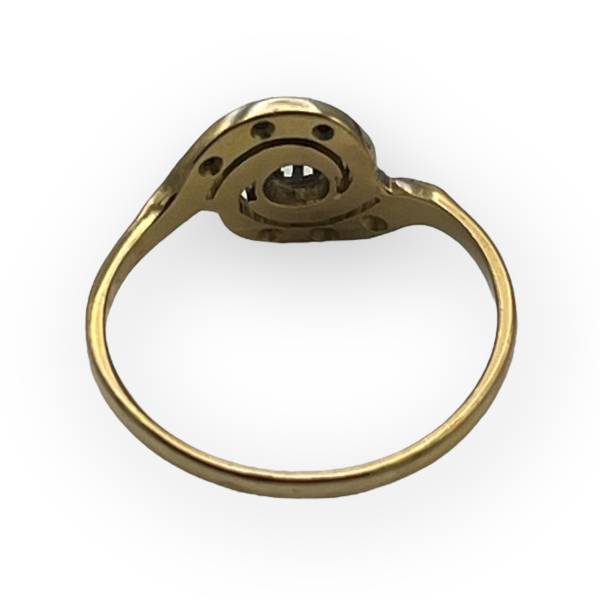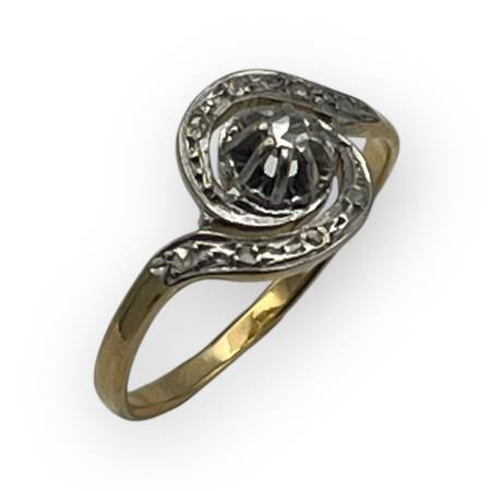 Un joli tourbillon en or blanc et oxydes de zirconium sur un anneau en or jaune. Fabrication française. Style ancien.