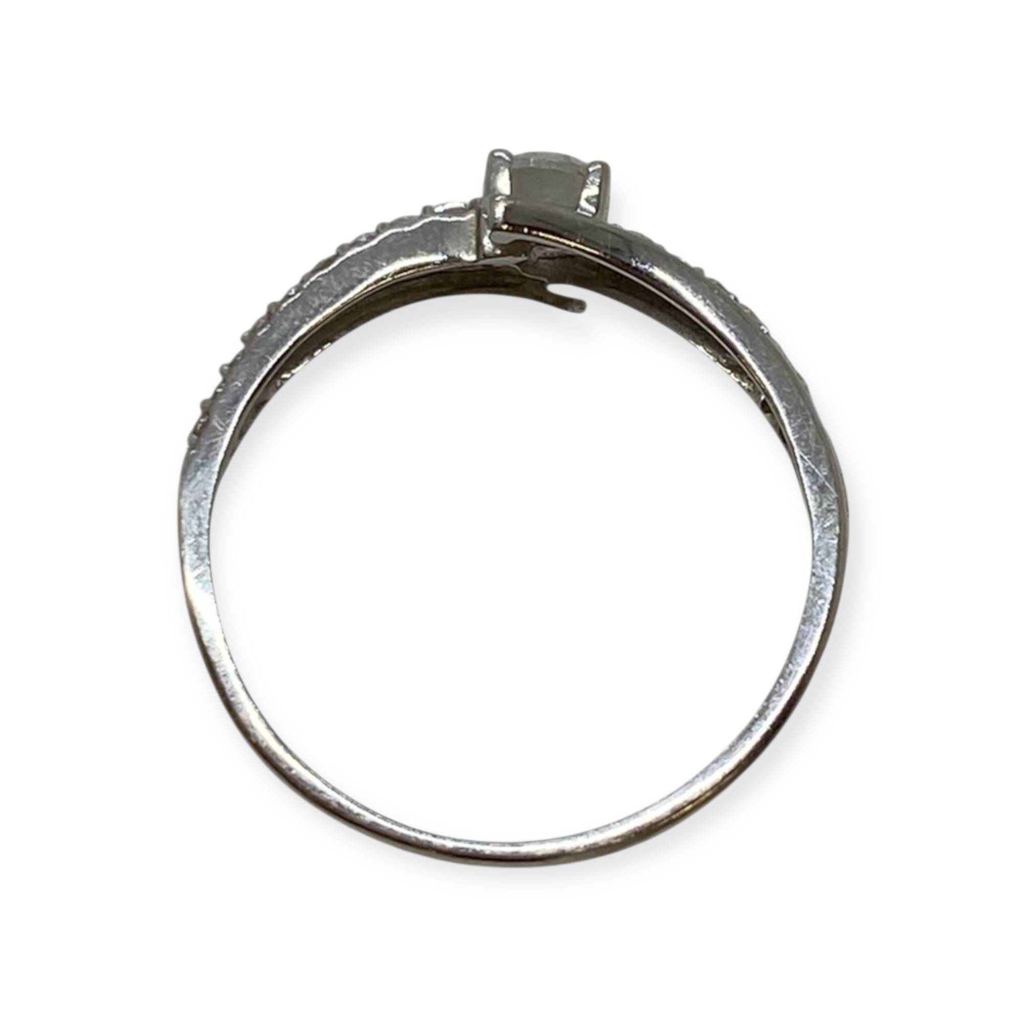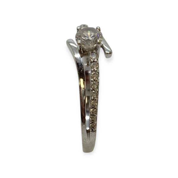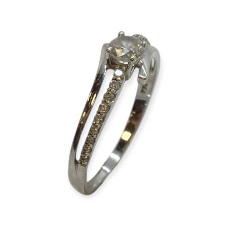 Bague de style solitaire épaulé, en or blanc 750/1000 (18k) sertie d’un oxyde de zirconium central et d’oxydes de zirconium d’accompagnement sur les épaules.