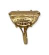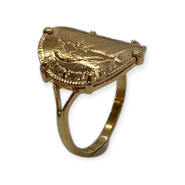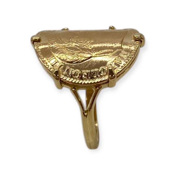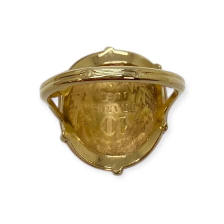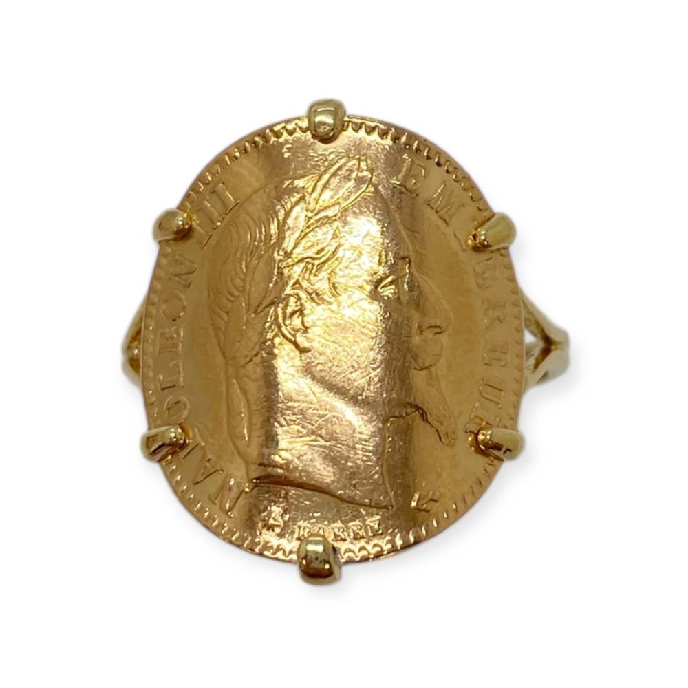 Bague composée d’une monture en or 750/1000 (18k), sertissant une véritable pièce Napoléon III de 10 francs en or 900/1000 (21,6k). Ce type de bijou, appelé bague pièce, est caractéristique des créations de la fin du XIXᵉ et du début du XXᵉ siècle, associant valeur historique et esthétique. La pièce Napoléon III, emblématique du Second Empire, confère à cette bague un fort caractère patrimonial, tandis que la monture en or 750 assure solidité et élégance.