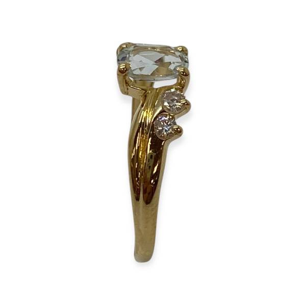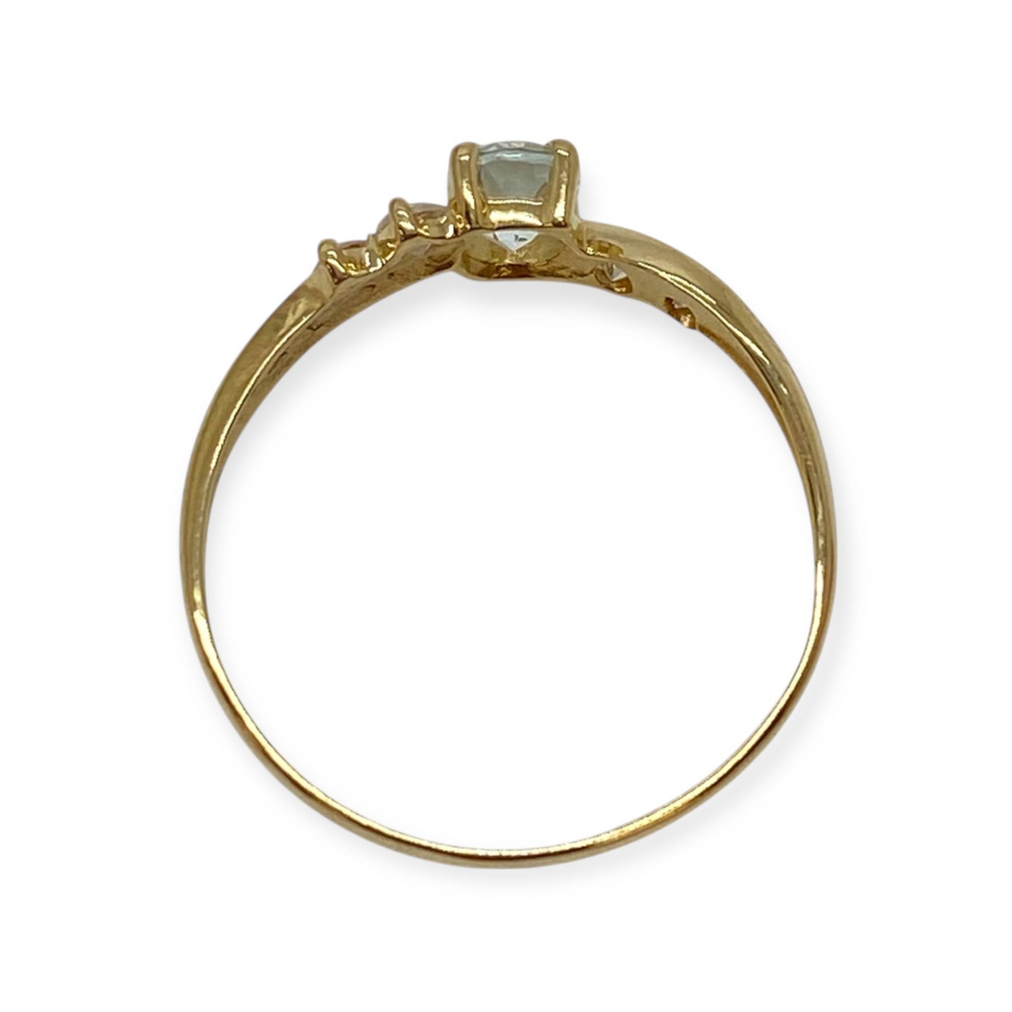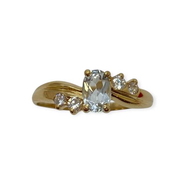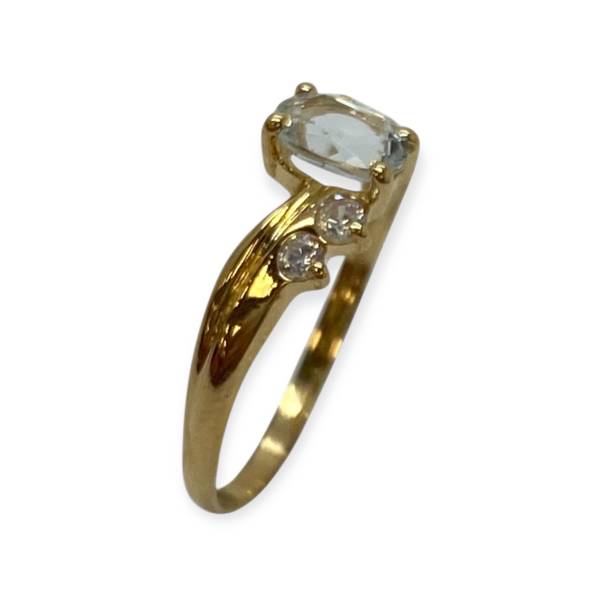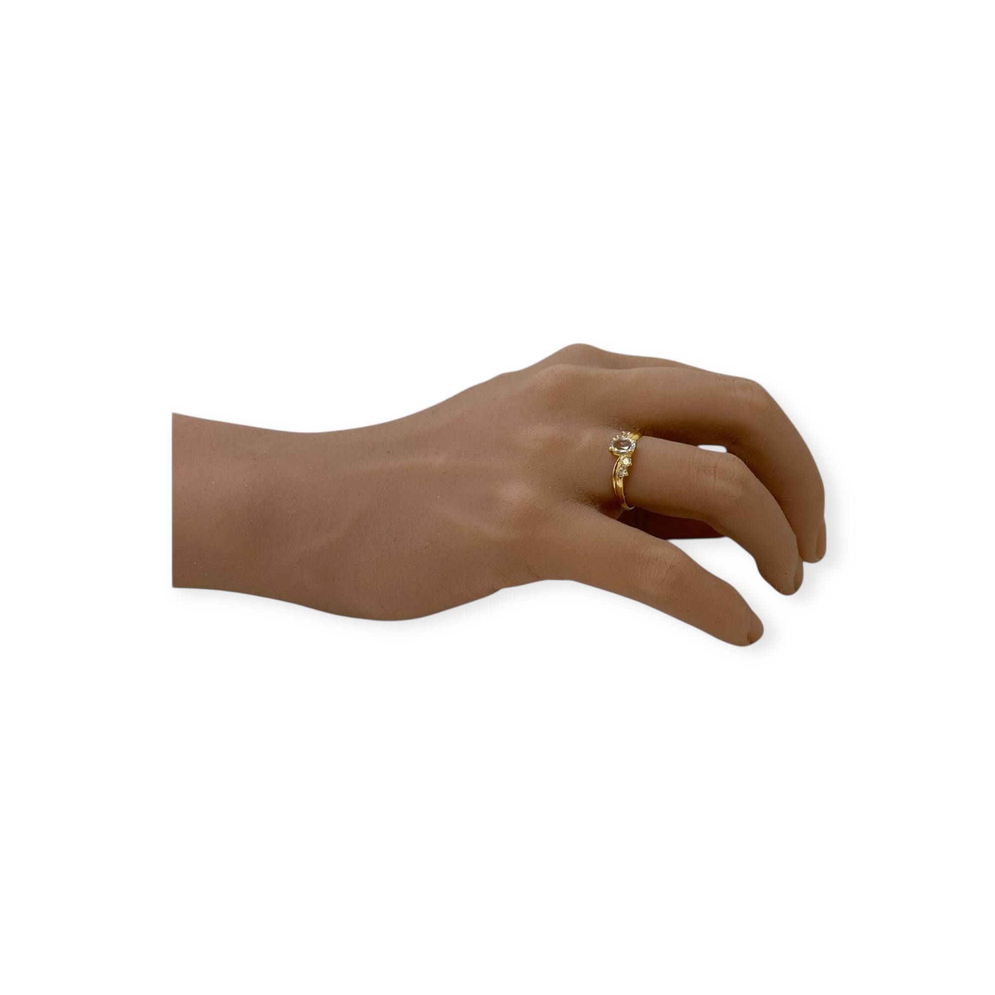 Bague en or jaune 750/1000 (18 carats), ornée d’un oxyde de zirconium central de taille ovale, accompagné de petits oxydes de zirconium disposés de part et d’autre. La monture présente un design fluide et légèrement croisé, mettant en valeur la pierre centrale tout en apportant équilibre et élégance à l’ensemble. Un bijou raffiné, idéal pour un usage quotidien ou comme bague habillée.