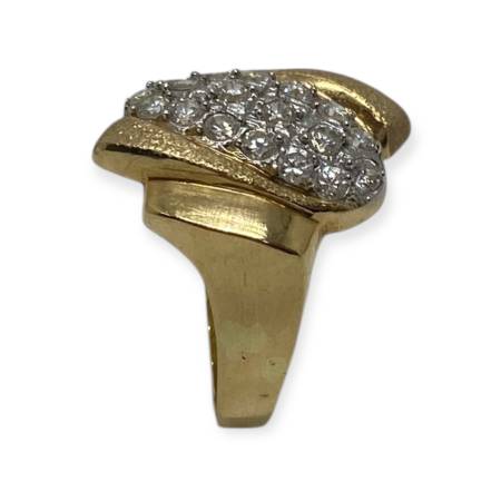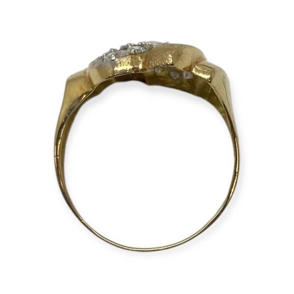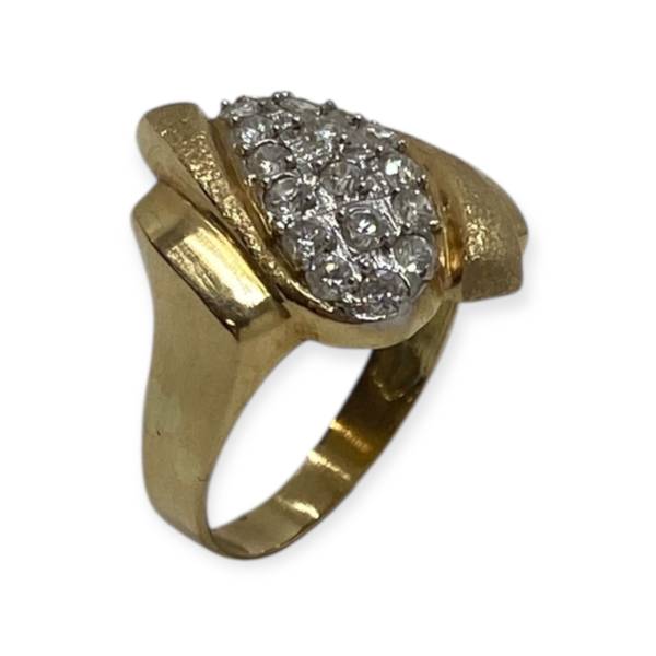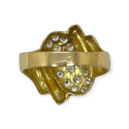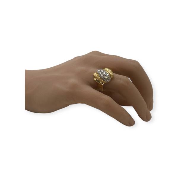 Bague en or 750/1000 (18k), ornée d’un pavage d’oxydes de zirconium formant un motif central lumineux, mis en valeur par un travail d’or texturé. Un bijou élégant et affirmé, au bel éclat.