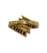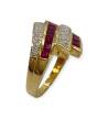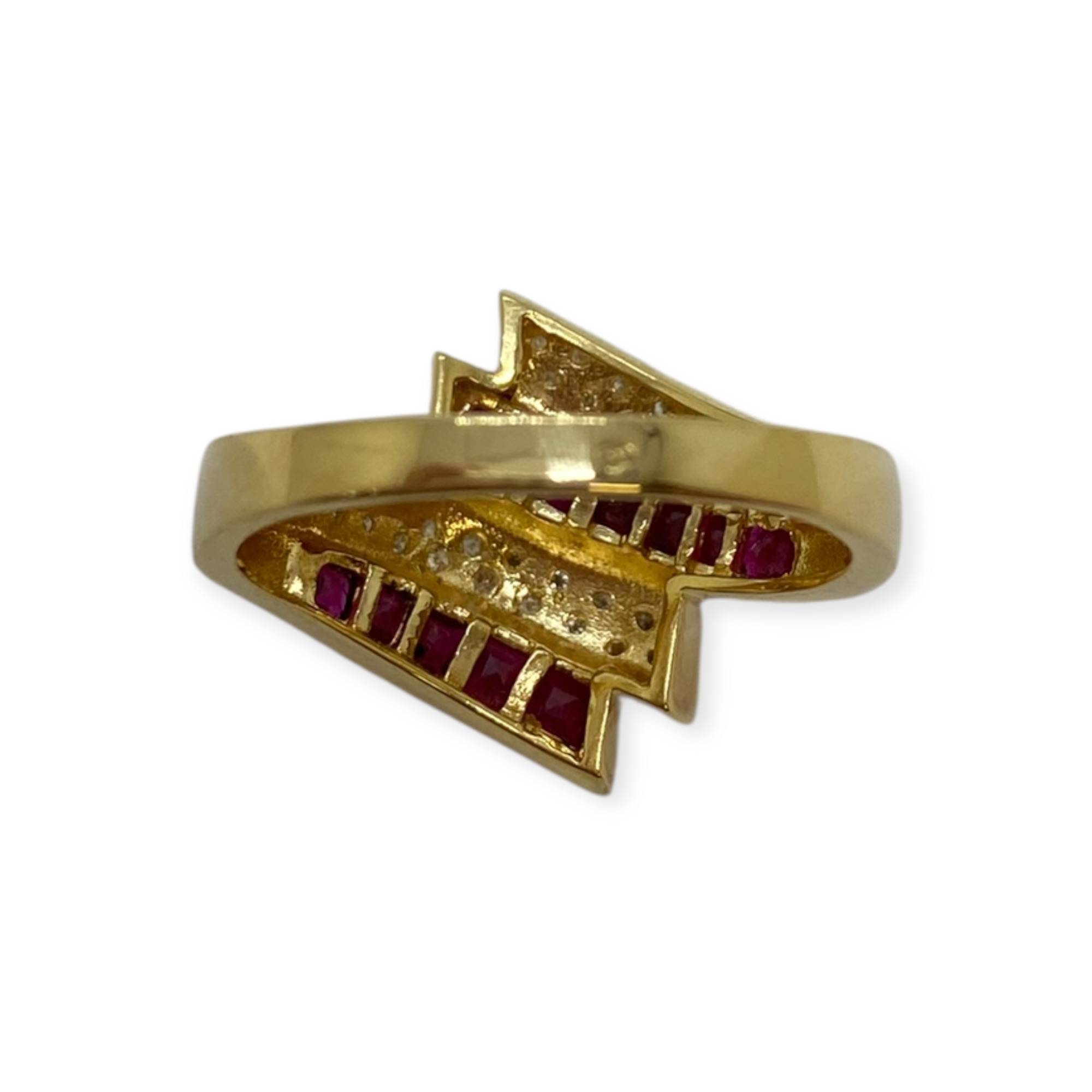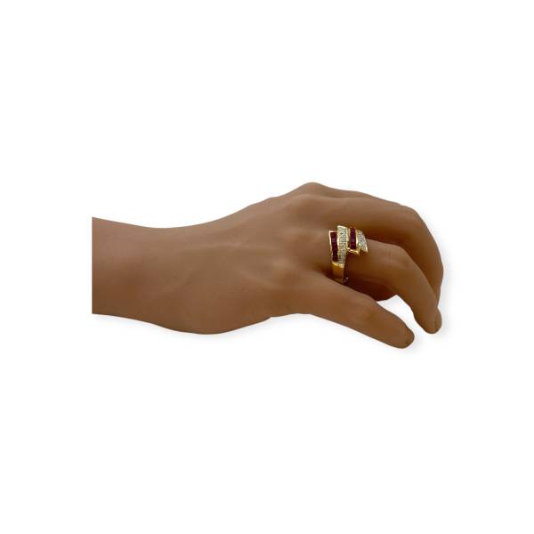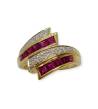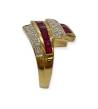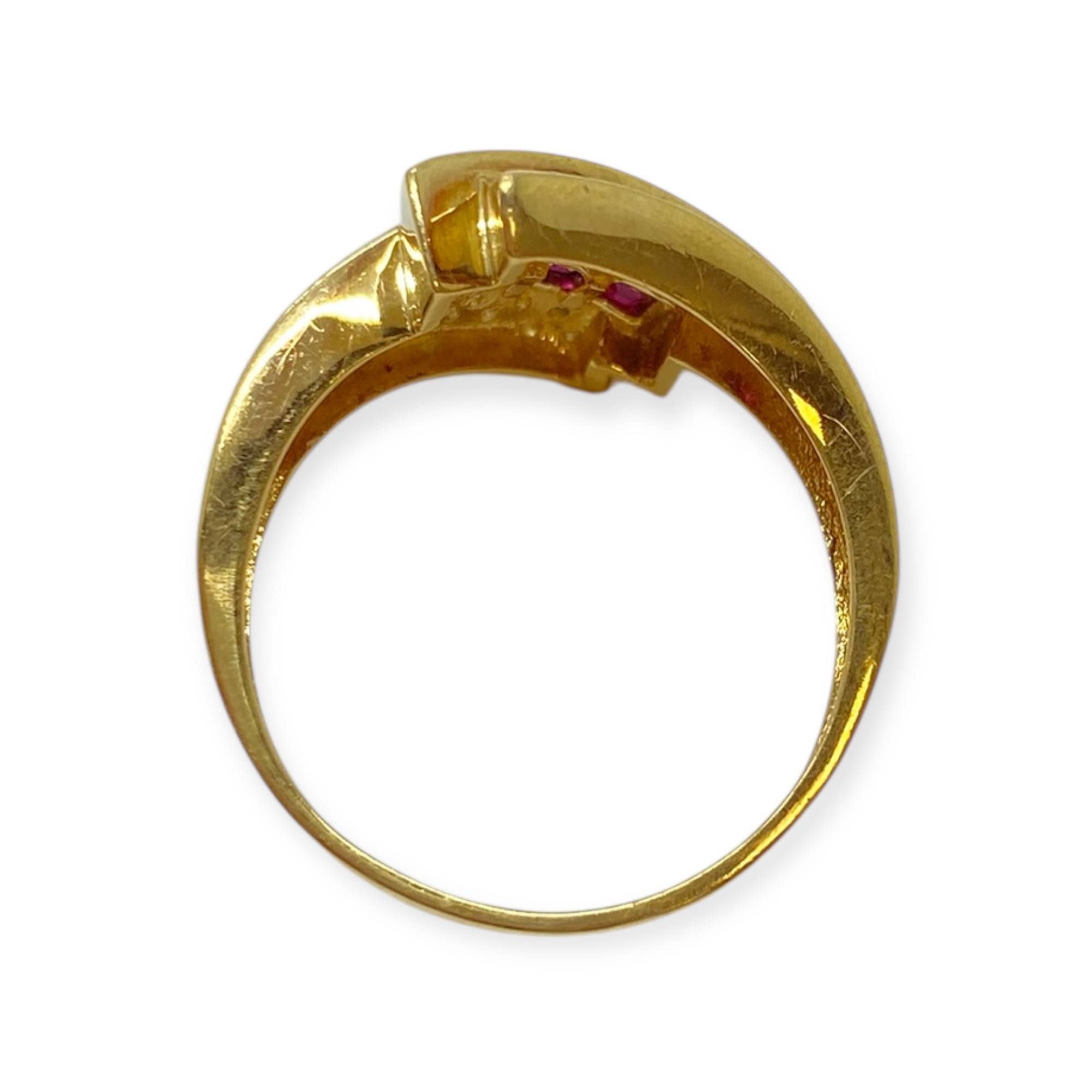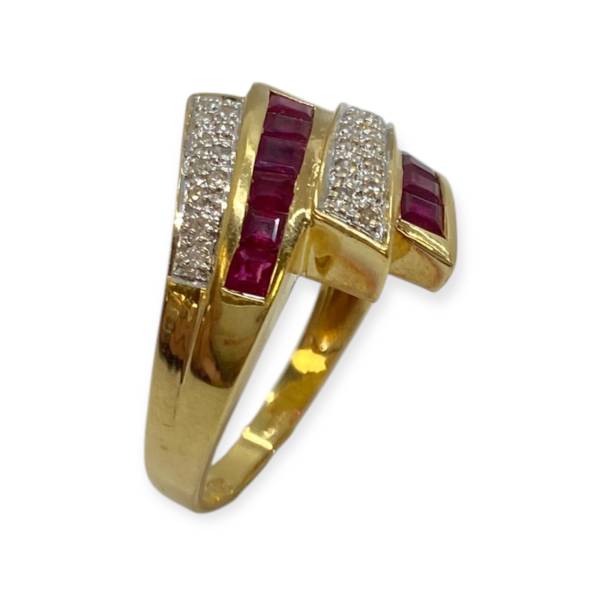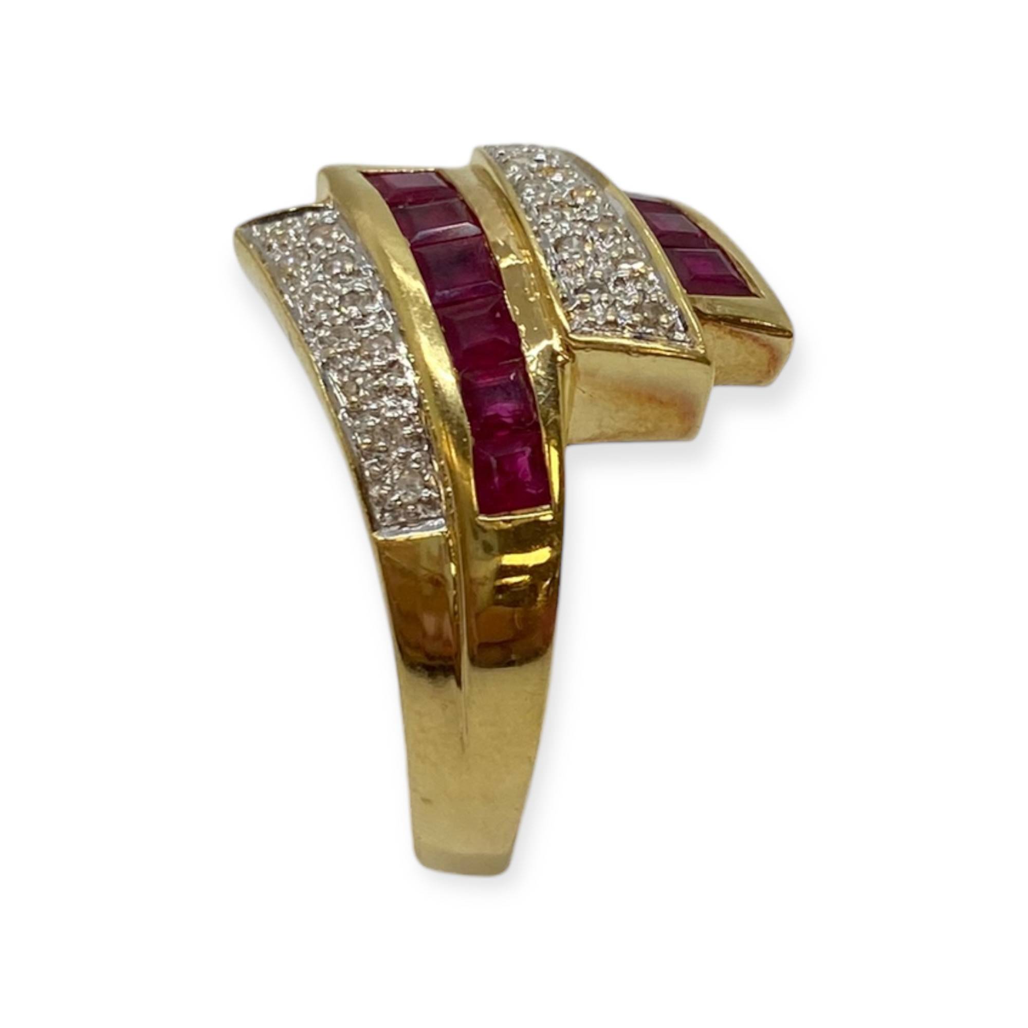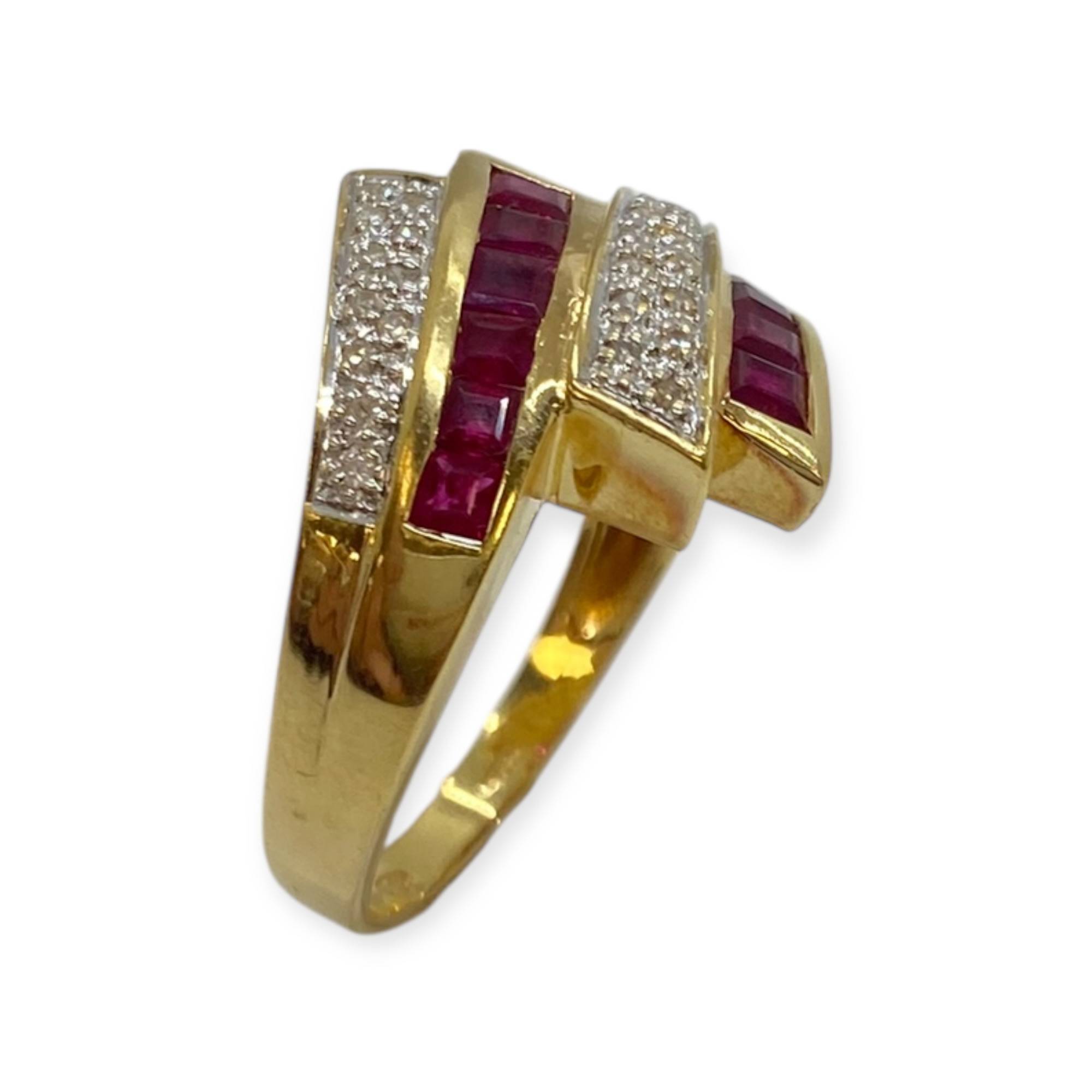 Bague en or jaune 750/1000 (18K) sertie de rubis et diamants. Design croisé élégant et lumineux, au style raffiné et précieux.