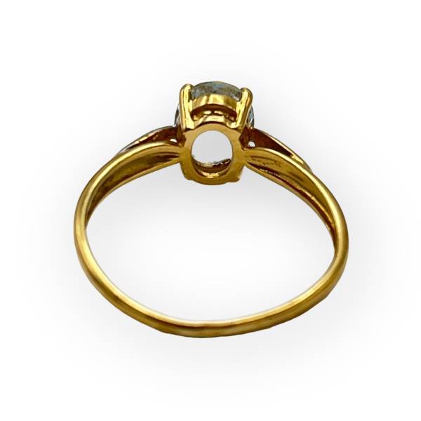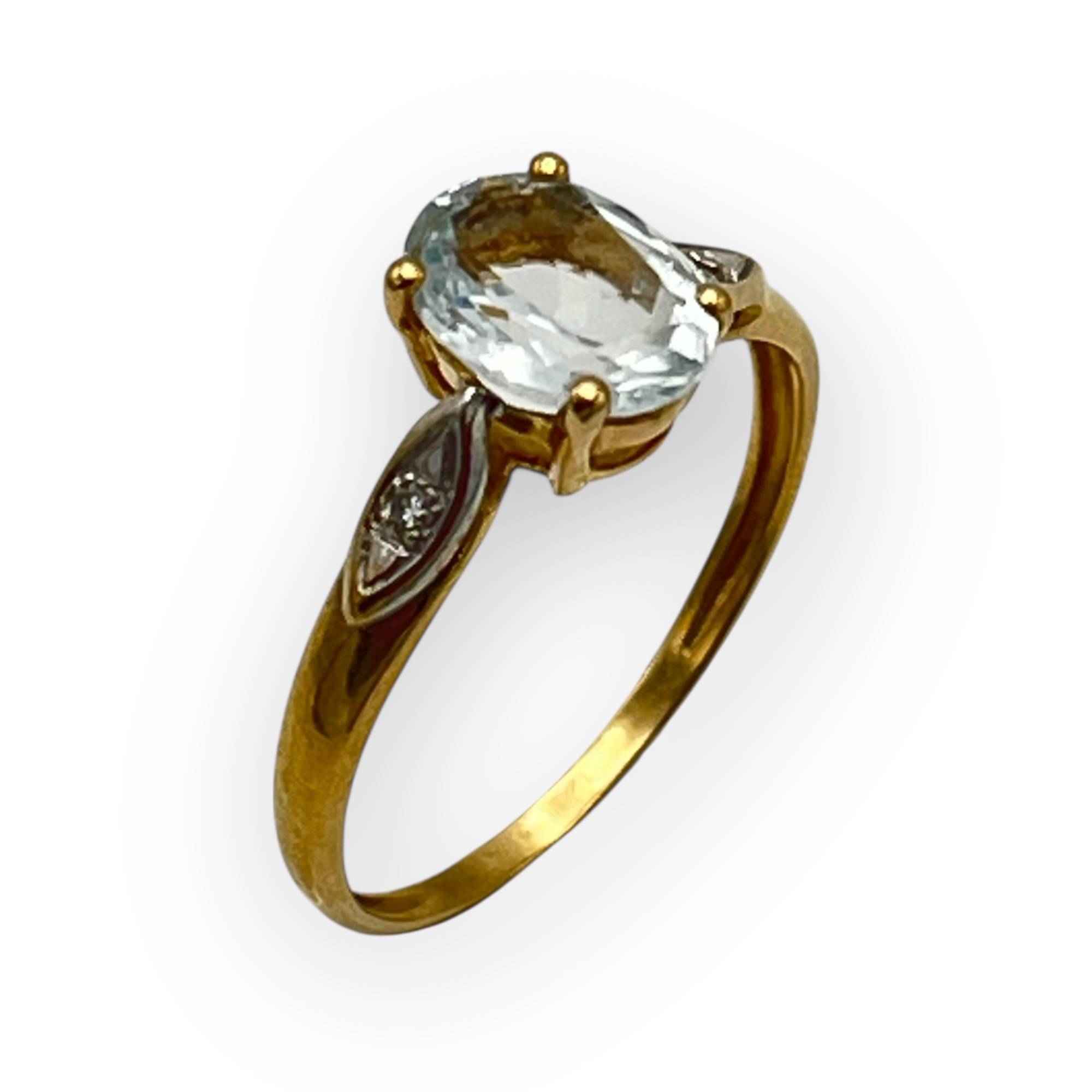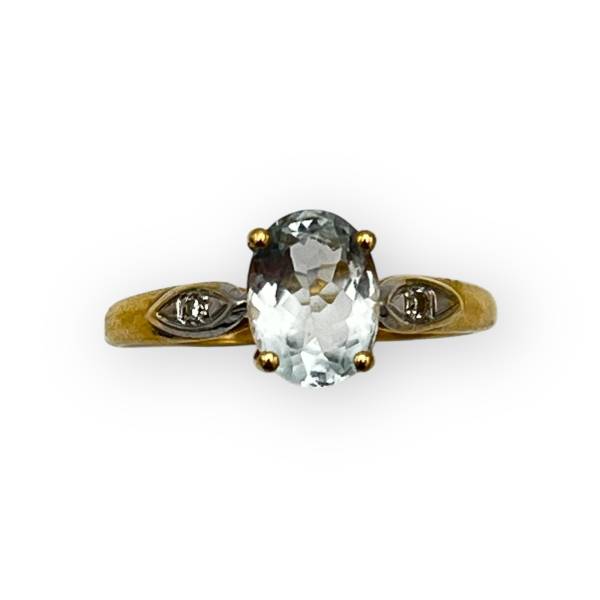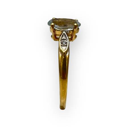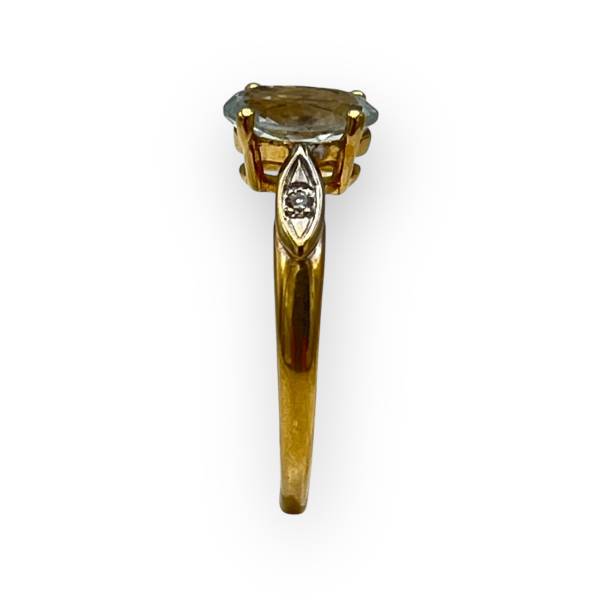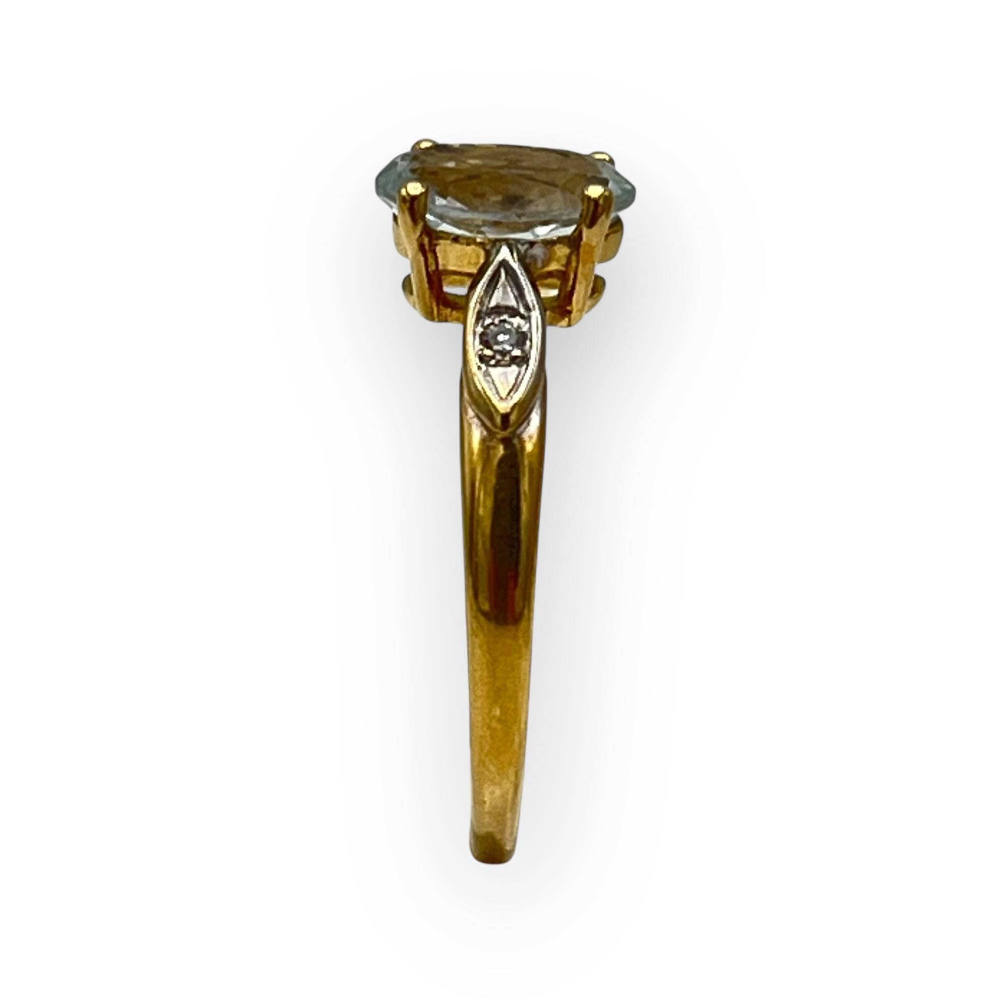 Bague en or jaune 750/1000 sertie d’une aigue-marine ovale et de diamants, au style classique.
