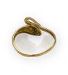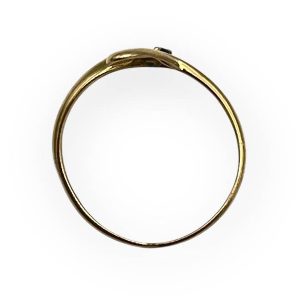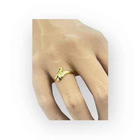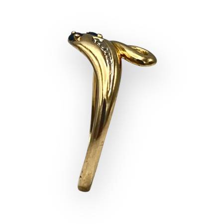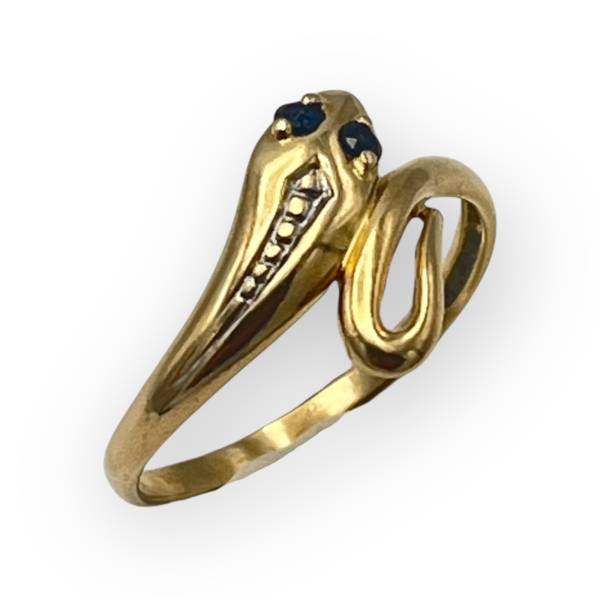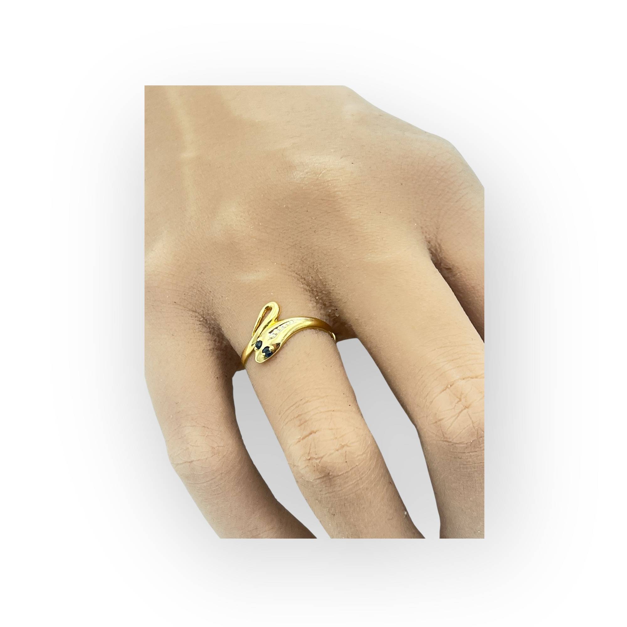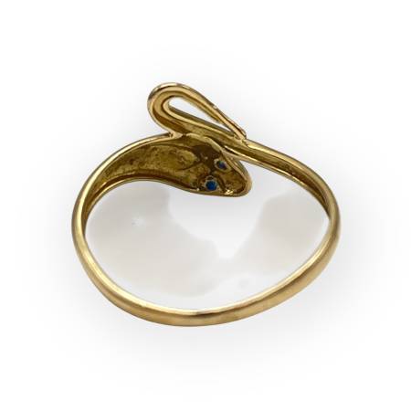 La tête stylisée est sertie de deux saphirs ronds figurant les yeux, avec un détail pavé en relief suggérant les écailles. Le corps lisse et poli s’enroule avec souplesse autour du doigt, créant un mouvement fluide et élégant.