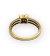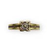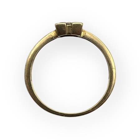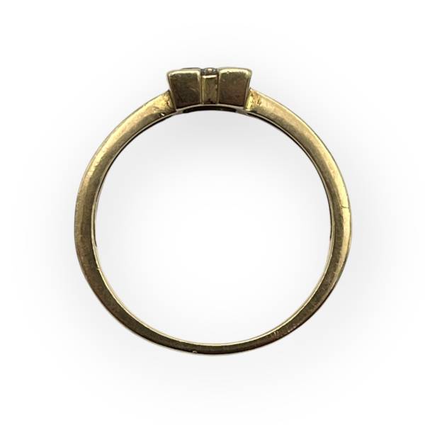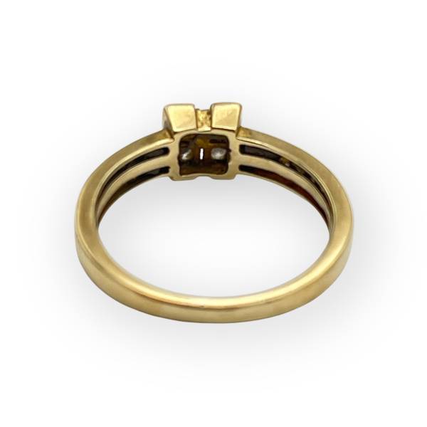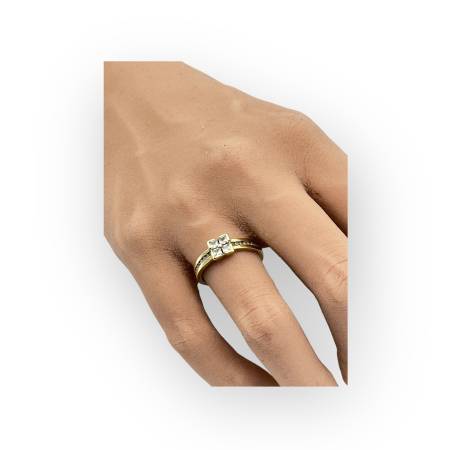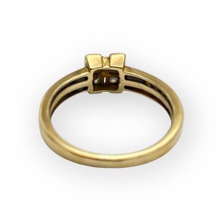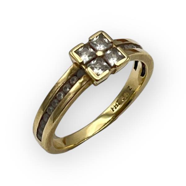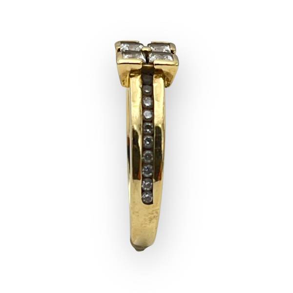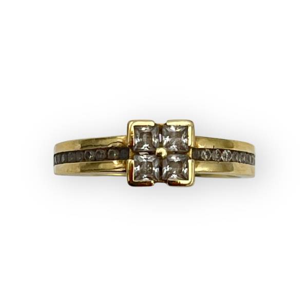 Bague en or 375/1000 sertie d’oxydes de zirconium. Le centre présente un motif carré de pierres facettées, prolongé par une ligne d’oxydes sur l’anneau qui apporte éclat et contraste