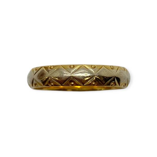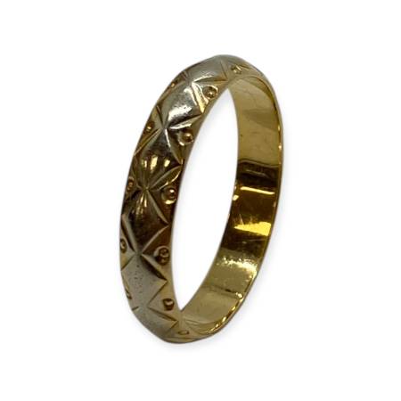 Alliance en or jaune et blanc 750/1000 décorée de motifs géométriques finement ciselés. Style vintage au relief élégant et caractère affirmé.
