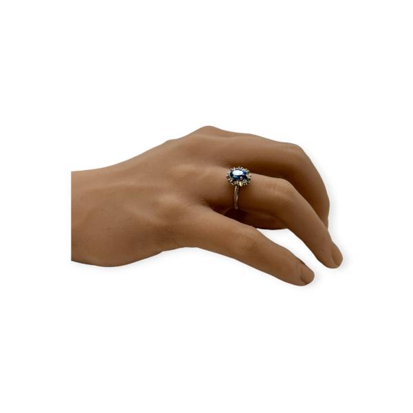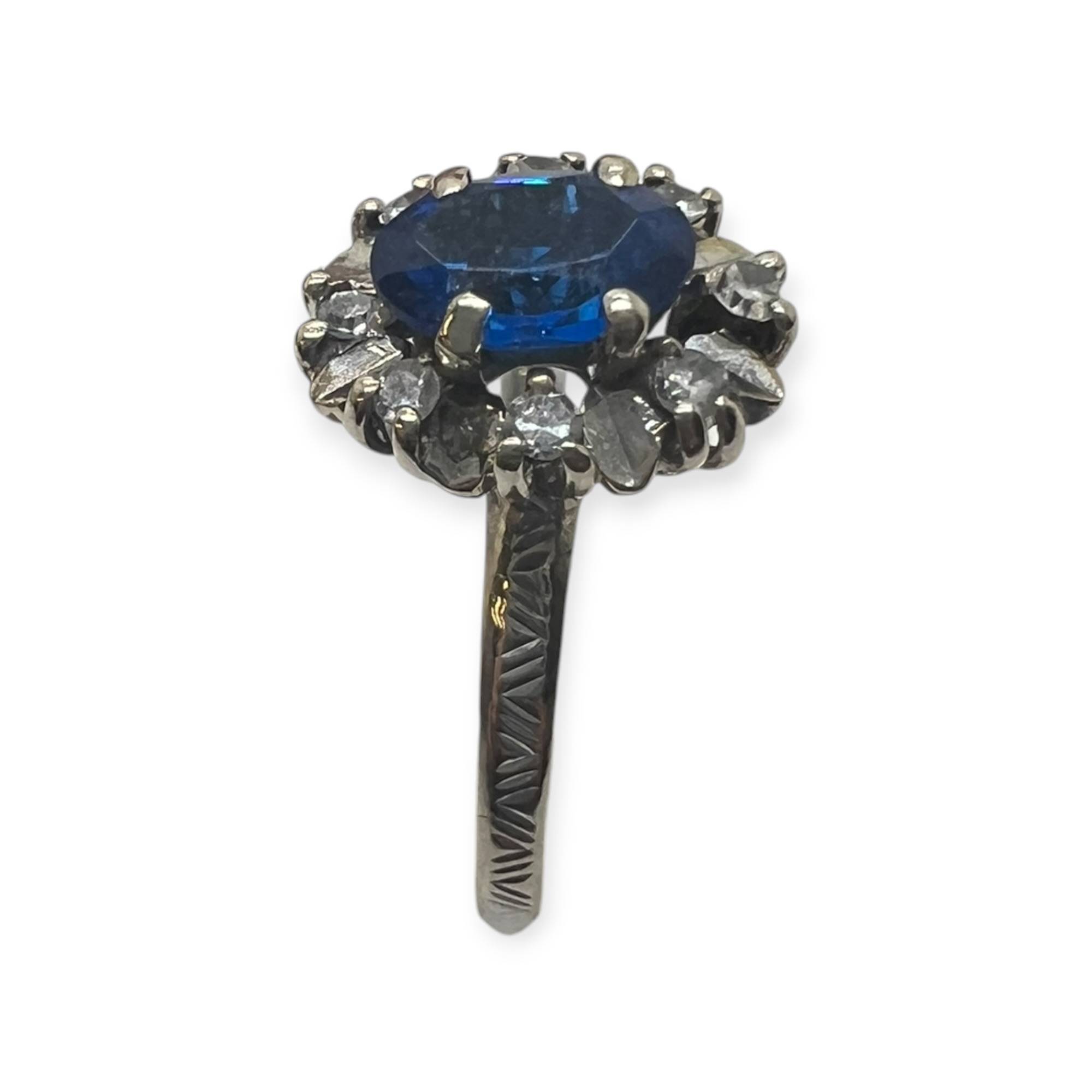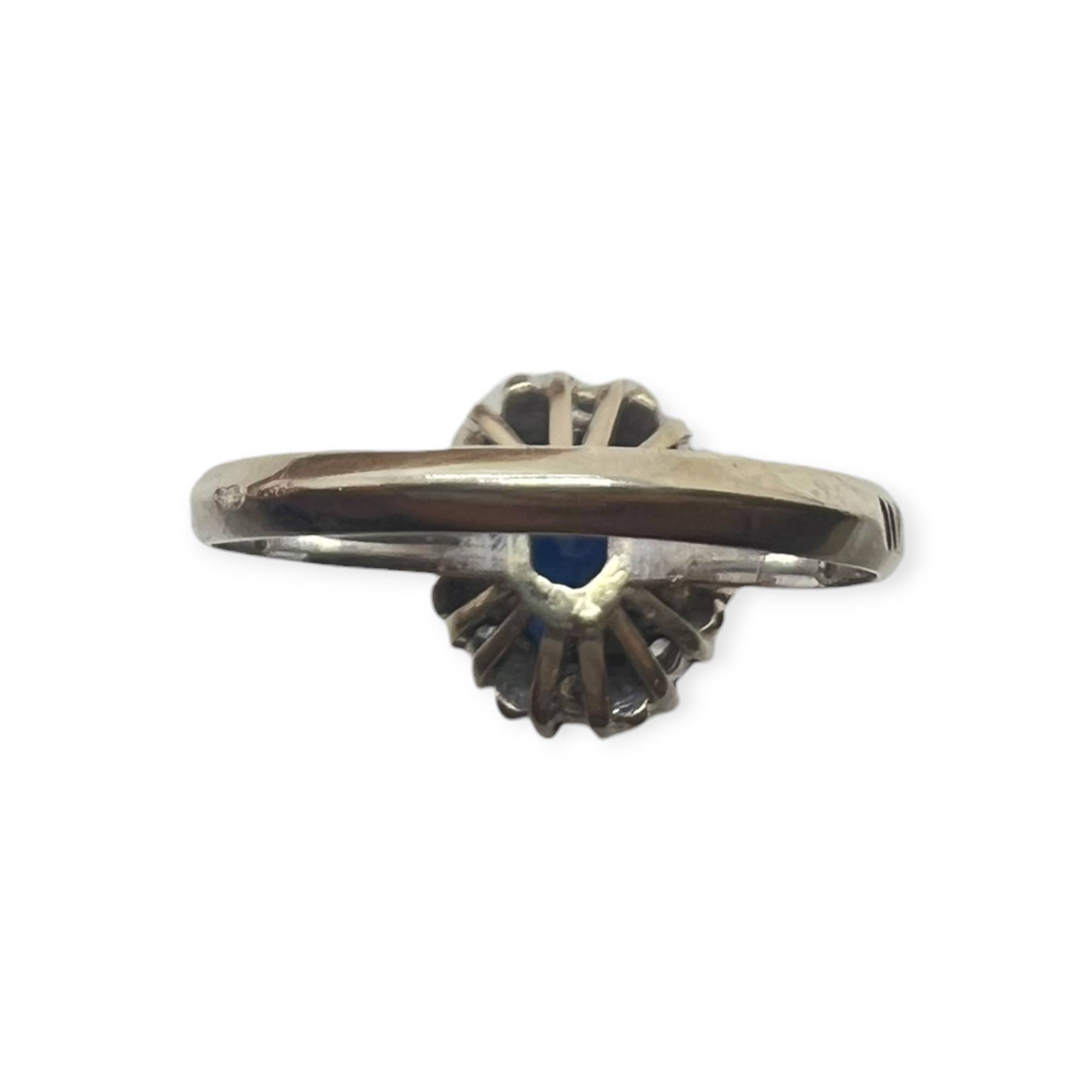 Bague en or 750/1000 (18k) ornée d’un saphir ovale en pierre centrale, entourée de diamants. Monture de style entourage mettant en valeur l’éclat et le contraste des pierres.