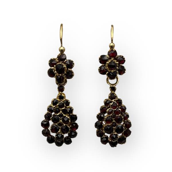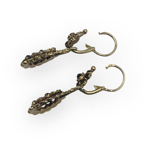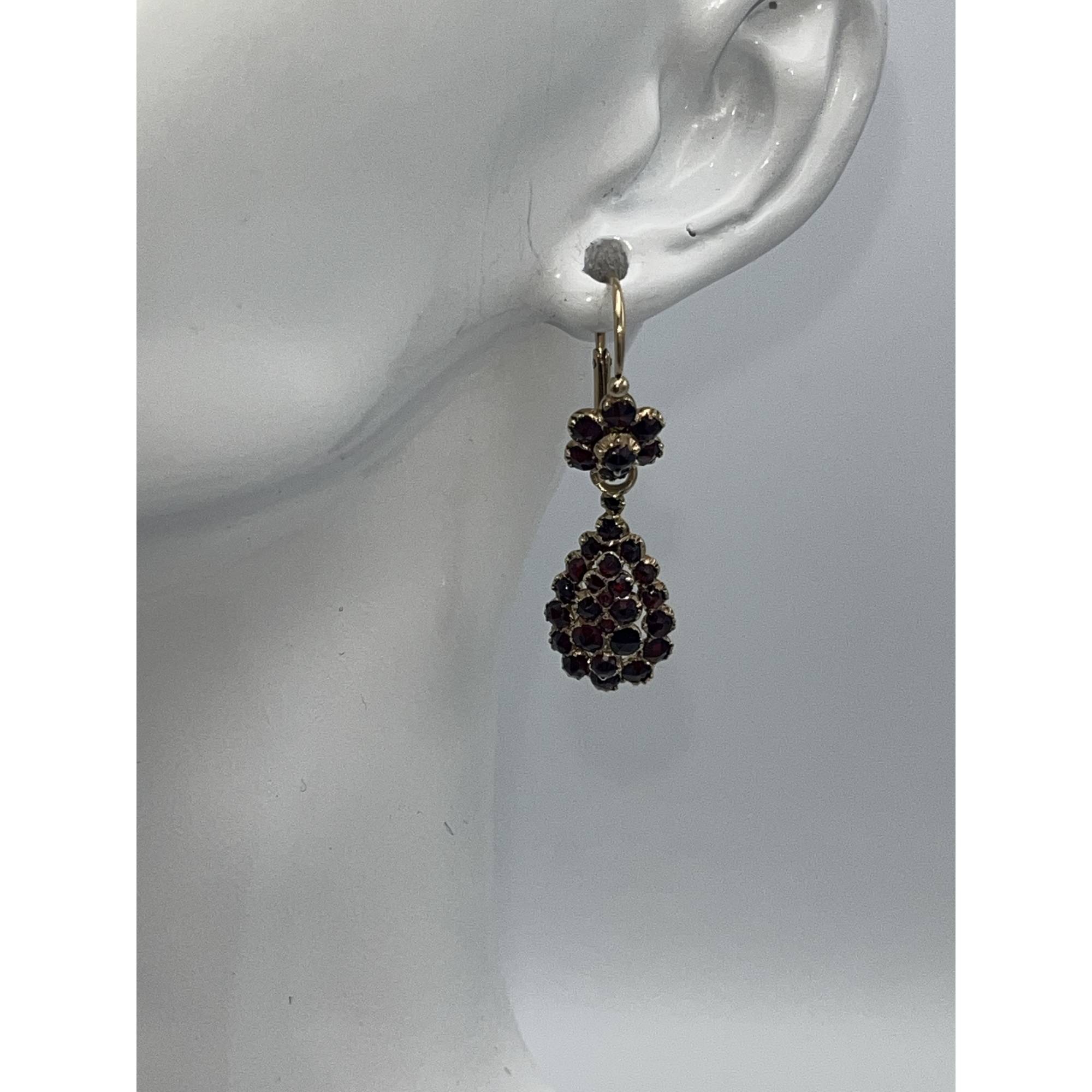 Magnifiques, ces boucles dormeuses style ancien serties de grenats. La partie basse peut se détacher de l'anneau principal pour les porter avec la petite felur de grenat uniquement. L'or jaune est légèrement cuivré mais ce n'est pas de l'or rose.