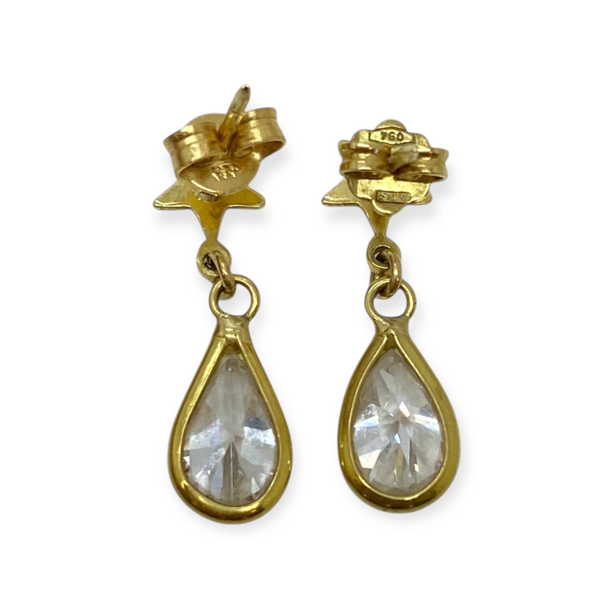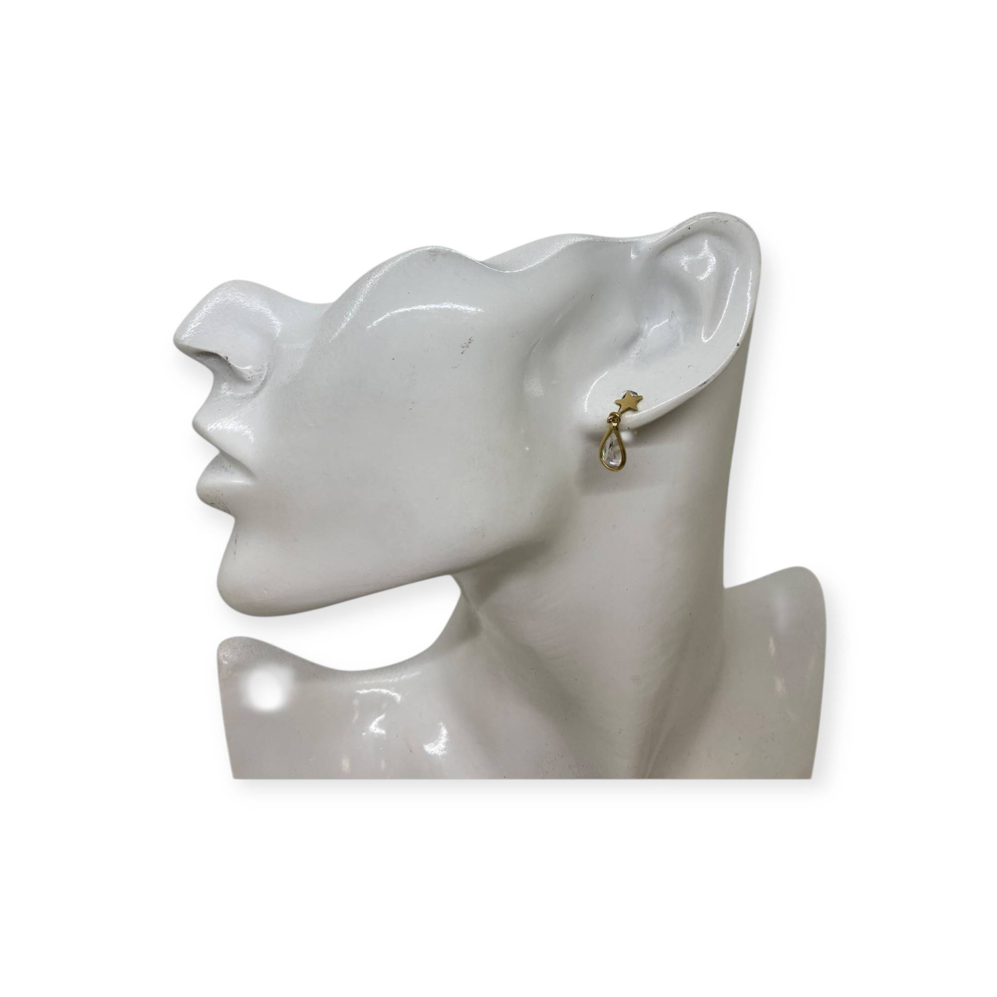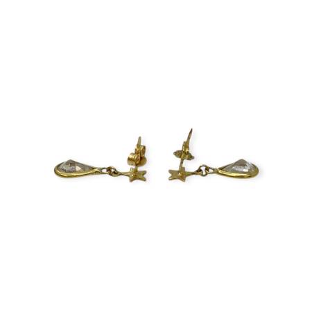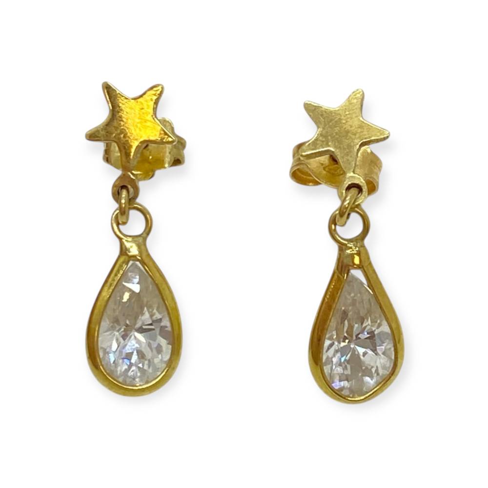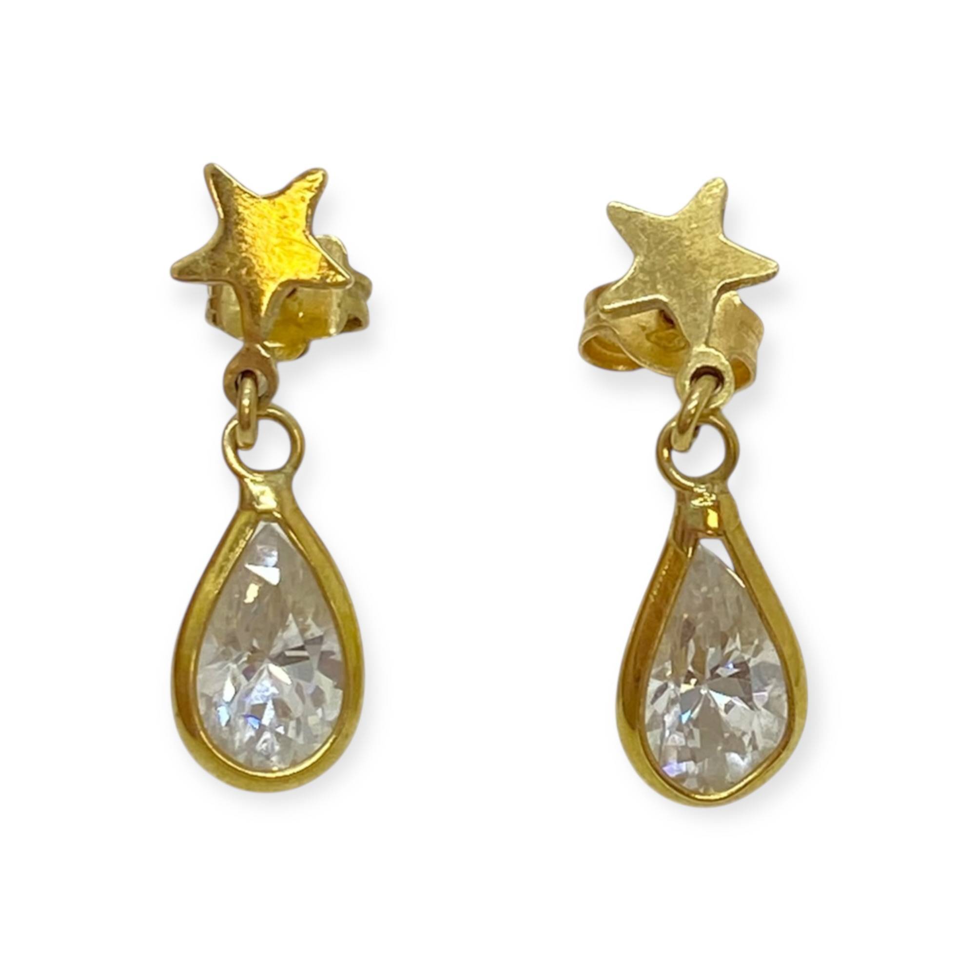 Paire de boucles d’oreilles pendantes, composées d’un clou en forme d’étoile surmontant une pampille goutte, en or jaune 750, sertie d’oxydes de zirconium taille poire.