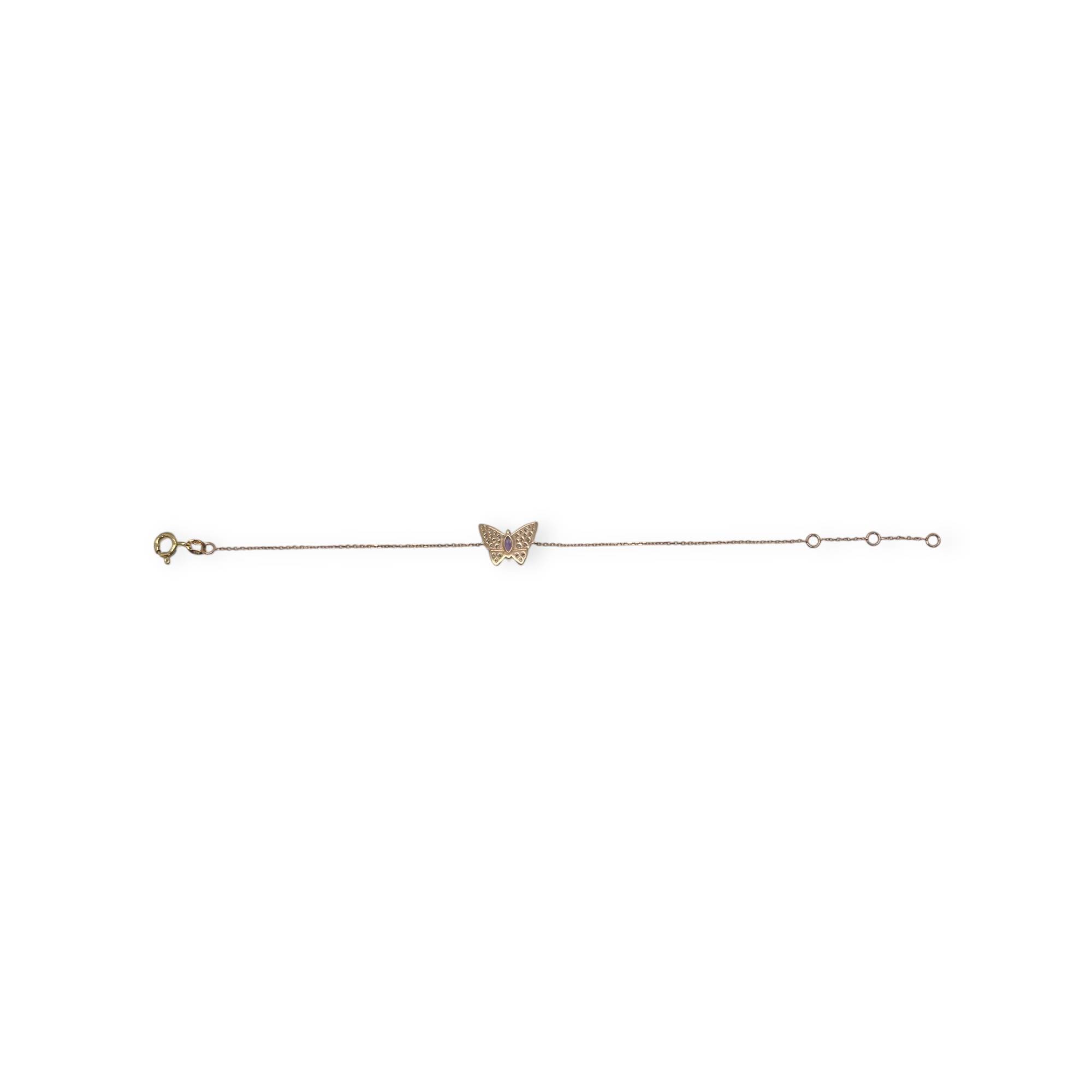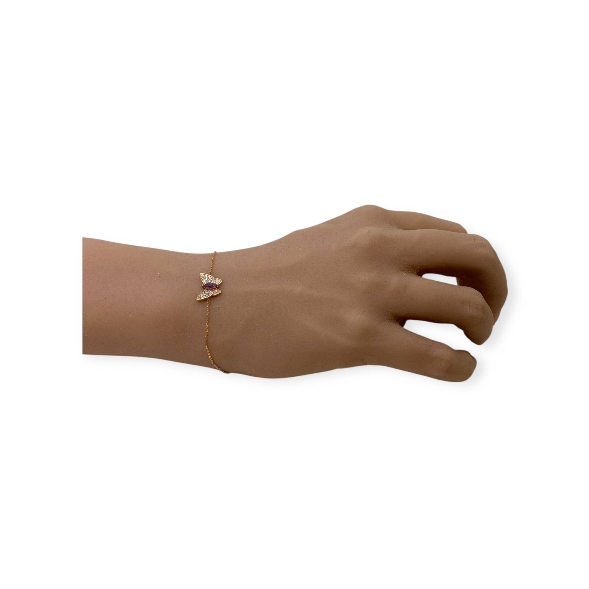 Bracelet fin en or rose, orné d’un motif papillon serti d’oxydes de zirconium et d’une pierre violette centrale. Un bracelet délicat et élégant, facile à porter au quotidien.