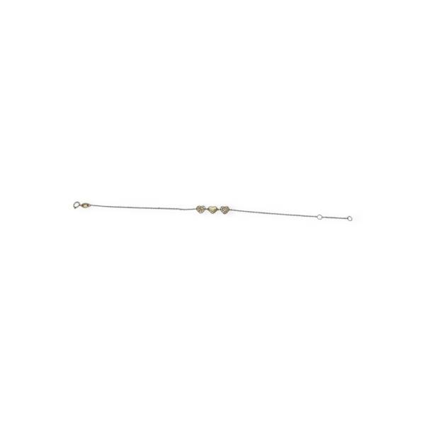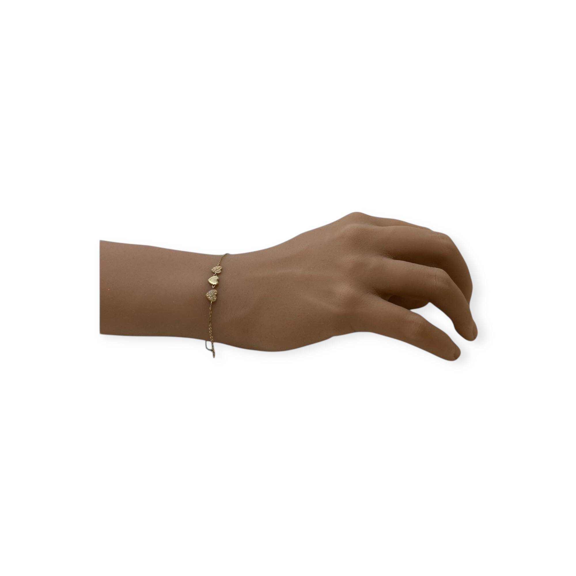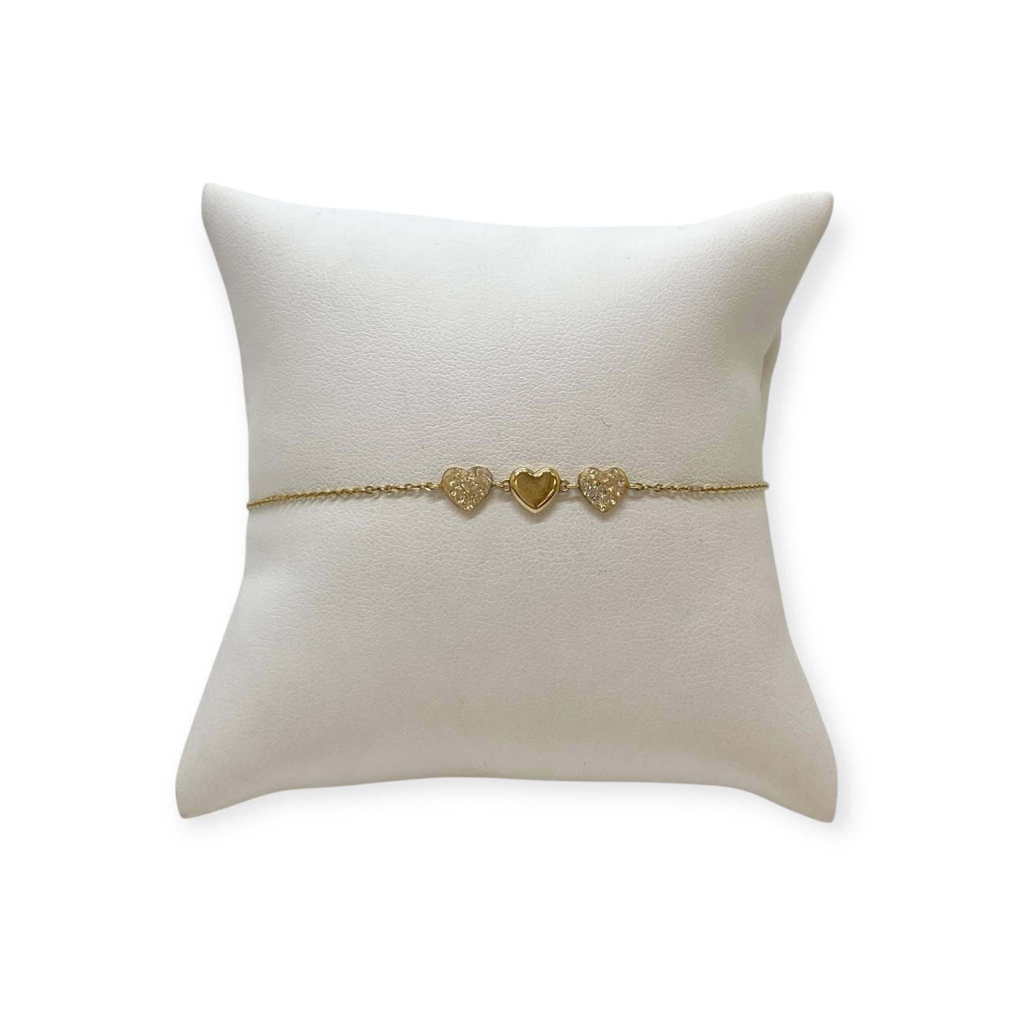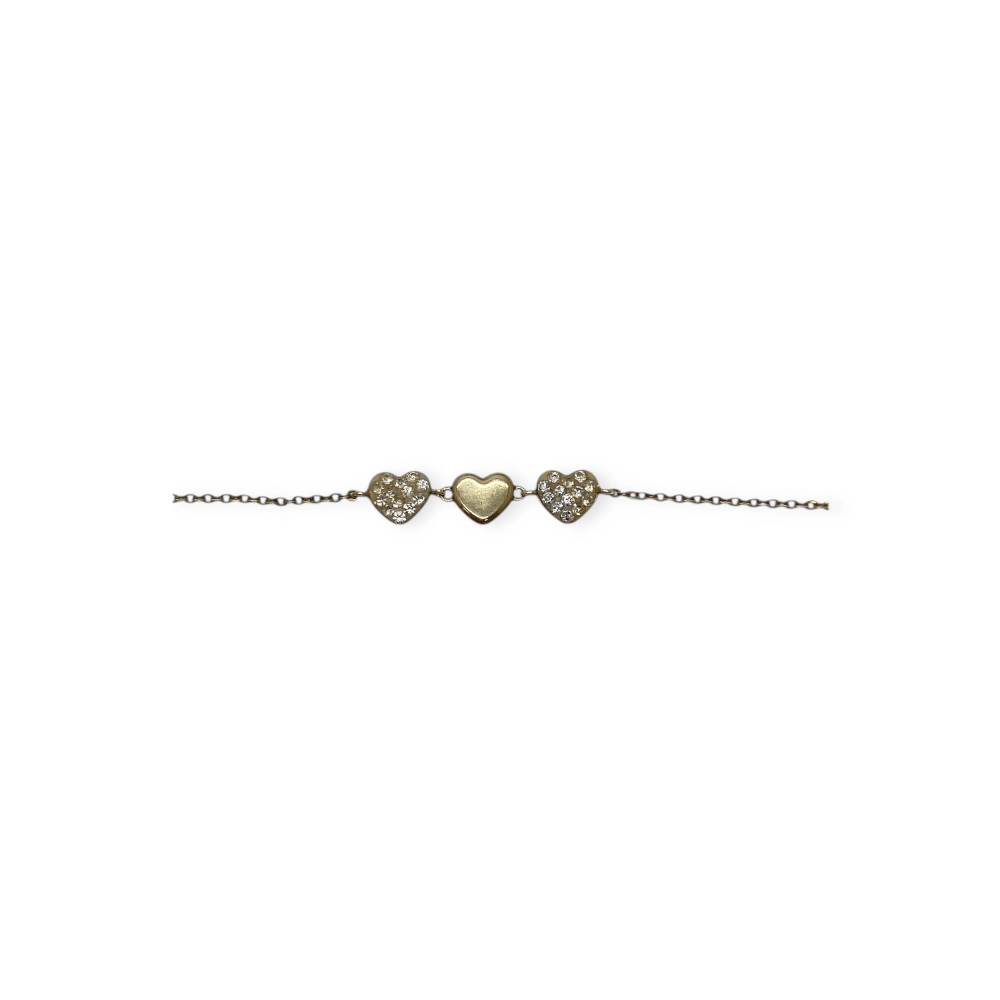 Bracelet en or jaune 375/1000 (9K), orné de trois cœurs sertis d’oxydes scintillants. Chaîne fine et élégante, réglable grâce à un anneau intermédiaire pour un ajustement optimal au poignet. Un bijou délicat et lumineux, idéal au quotidien comme pour une occasion spéciale.