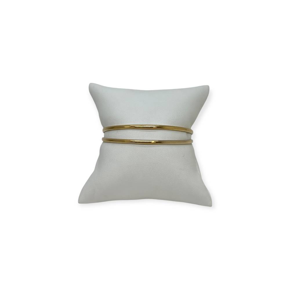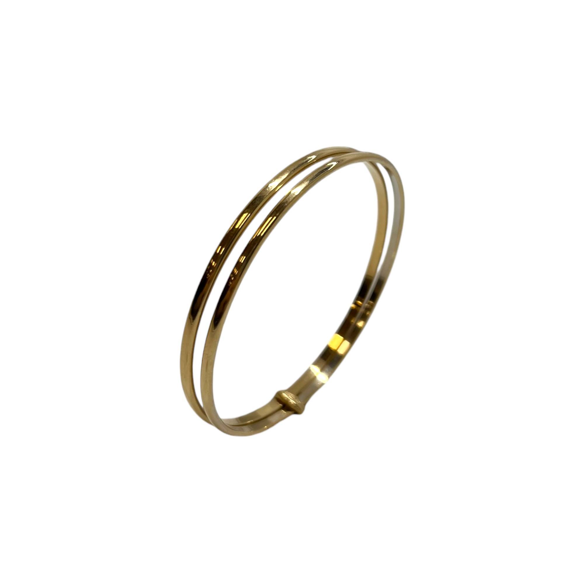 Bracelet jonc en or 750/1000 au design élégant composé de deux anneaux parallèles qui donnent du volume tout en restant fin et raffiné. Son style épuré et moderne en fait un bijou facile à porter au quotidien, seul pour un look minimaliste ou associé à d’autres bracelets. Un classique chic et intemporel.