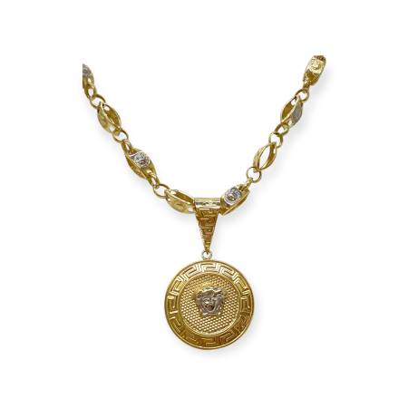Magnifique collier en or jaune et blanc 585/1000(14K), alliant luxe et raffinement. Sa chaîne à maillons bicolores met en valeur un pendentif rond orné du motif Méduse, symbole mythologique de force et de protection. Le contour du médaillon est sublimé par un décor géométrique finement ciselé, apportant une touche d’élégance intemporelle.