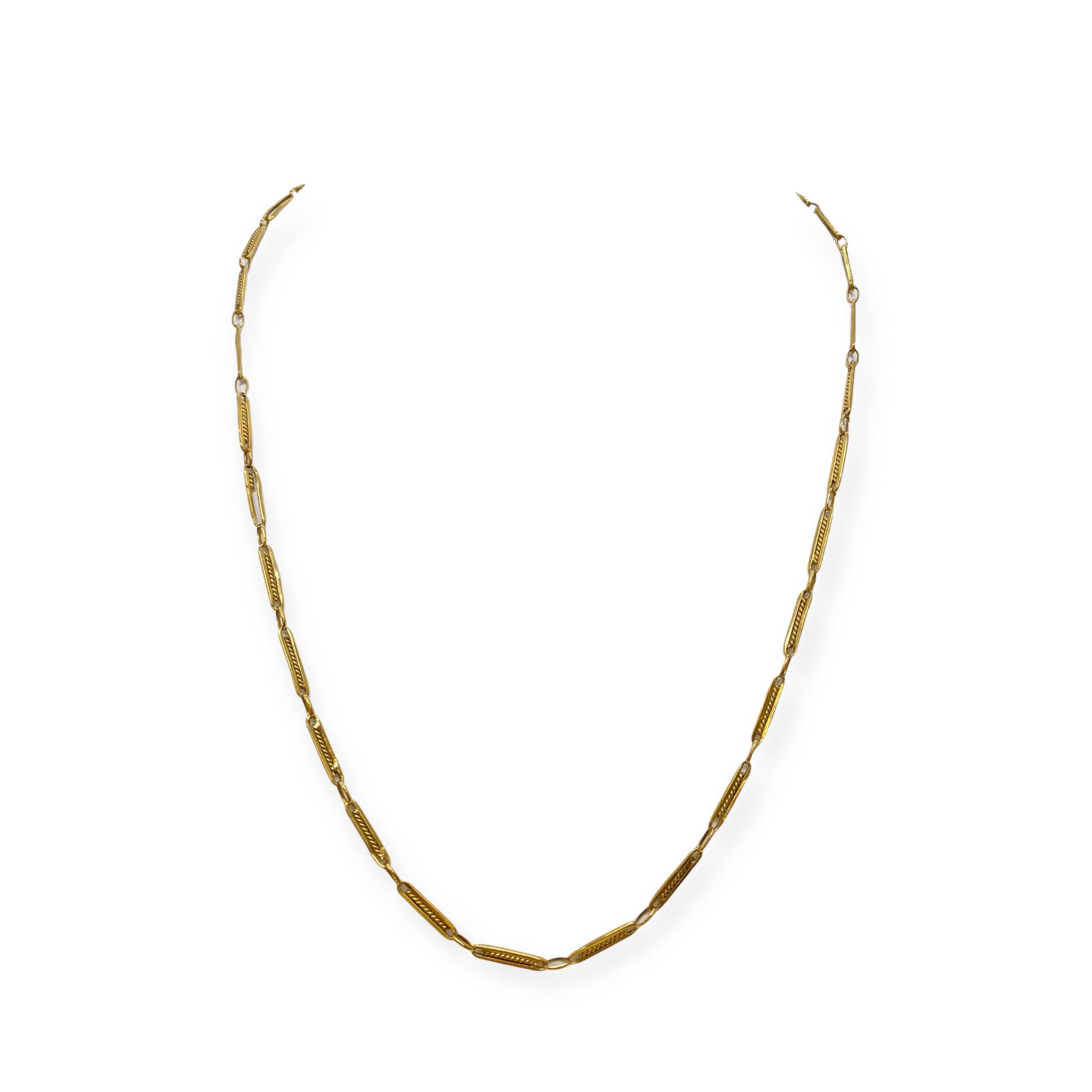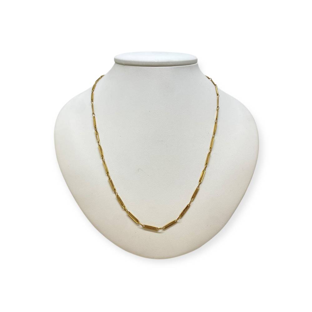 Collier en or jaune 750/1000 (18k) à maille alternée, composée de maillons allongés finement travaillés. Un design élégant et graphique, idéal porté seul ou avec un pendentif. Fermoir sécurisé, belle présence tout en restant raffinée.