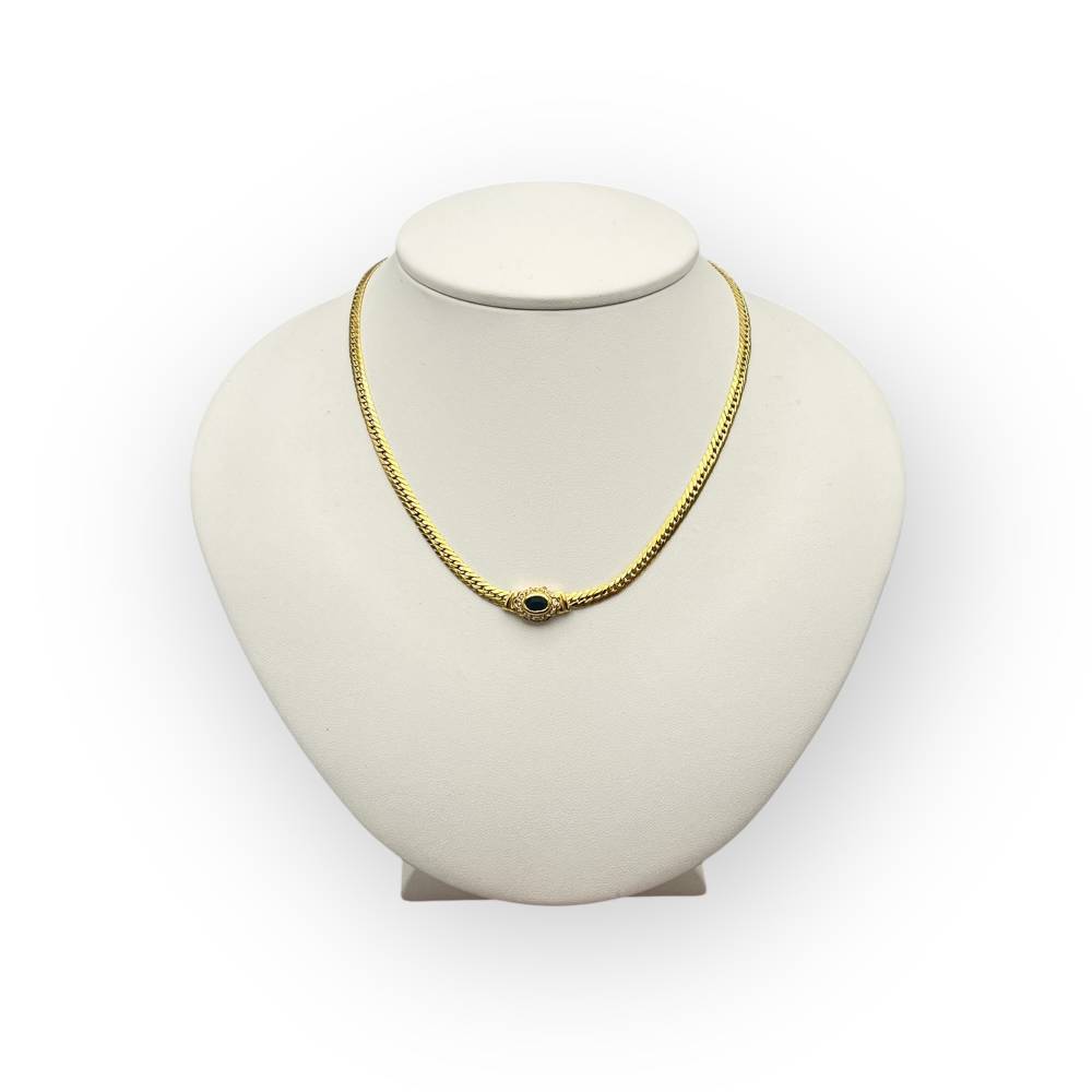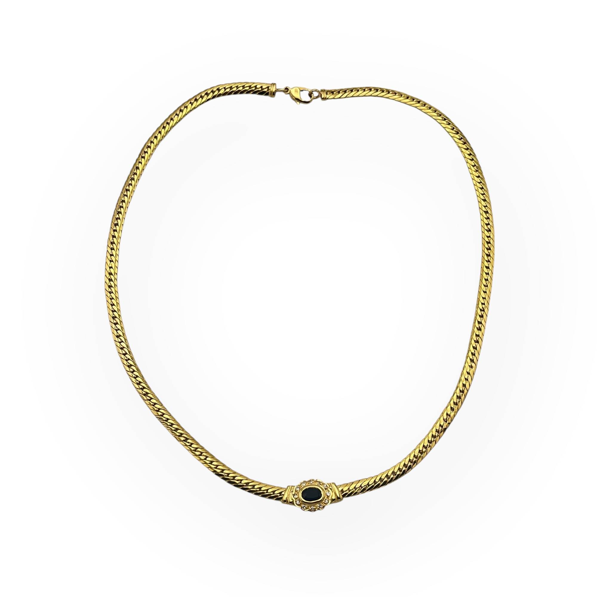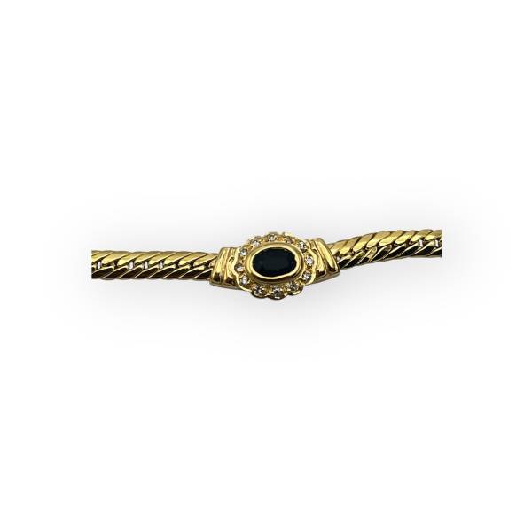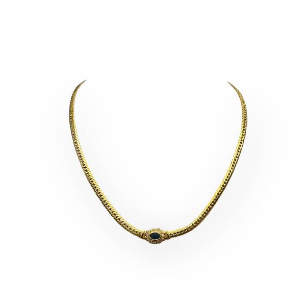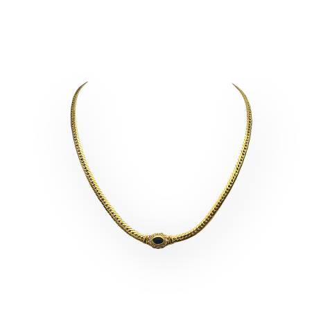 Collier en or jaune 750/1000 à maille anglaise, serti d’un saphir central entouré de diamants. Bijou de caractère : idéal porté seul, comme pièce maîtresse.