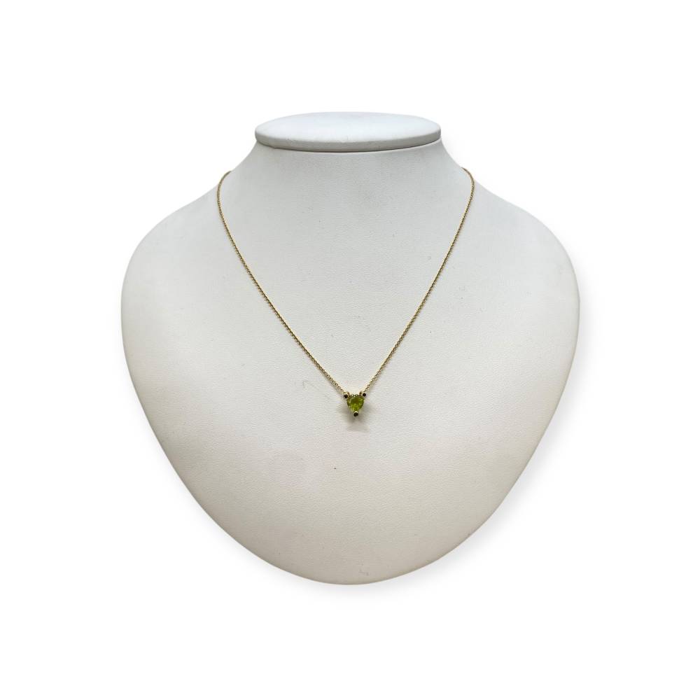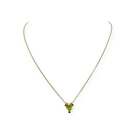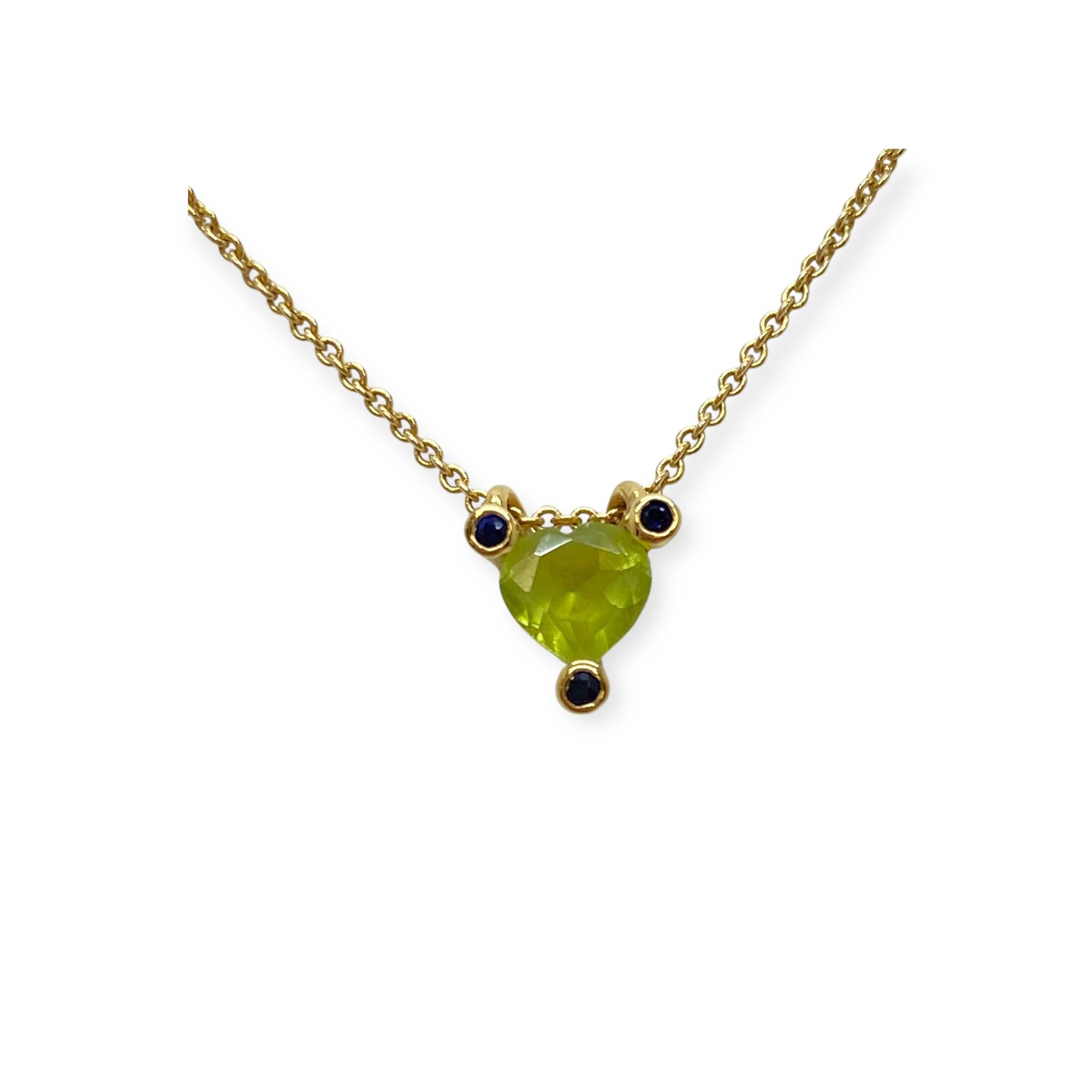 Collier en or 750 serti d’un péridot taillé en cœur, accompagné de trois saphirs bleus. Design délicat et lumineux, élégant au quotidien.