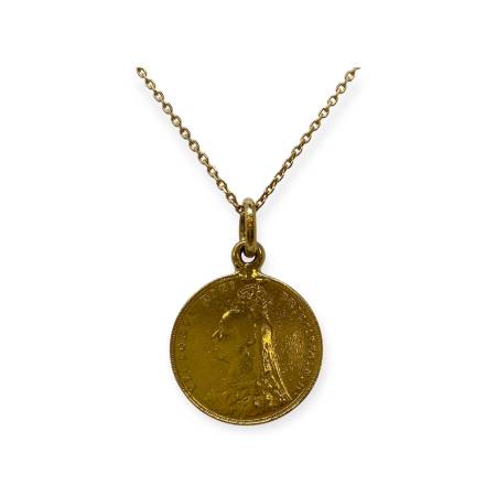 Magnifique pendentif en or 750/1000 (18K) avec une pièce d'or Souverain Britannique Victoria Jubilee de 1890 qui est en or 916/1000