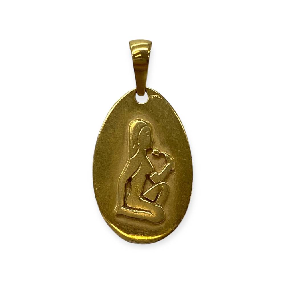 Pendentif en or 750/1000 (18k) orné d’un motif féminin stylisé en relief sur une médaille ovale. Un bijou au charme discret, à l’esthétique douce et intemporelle.