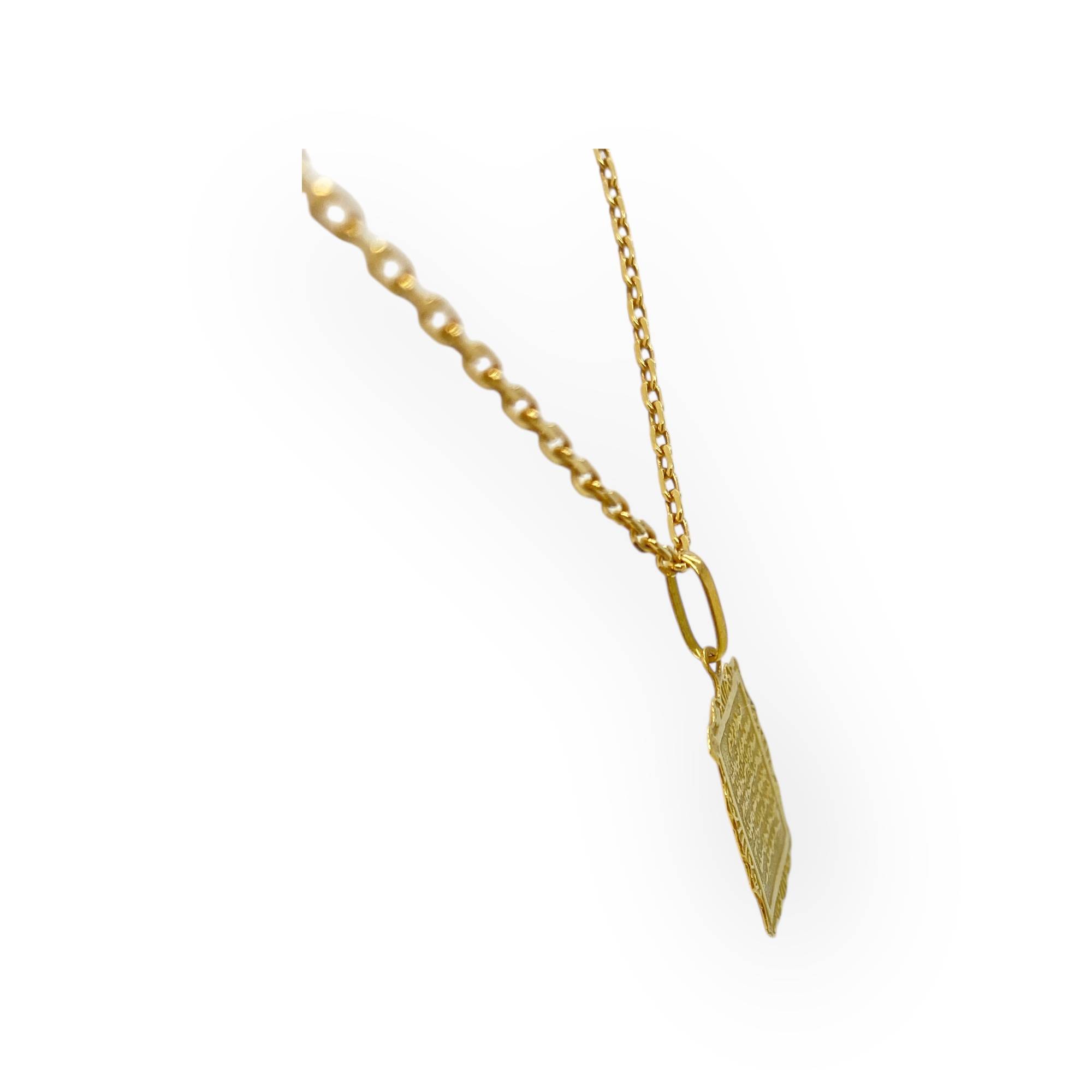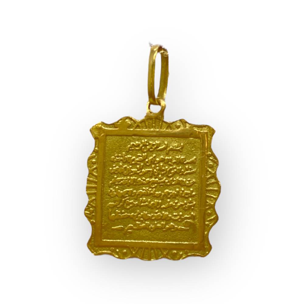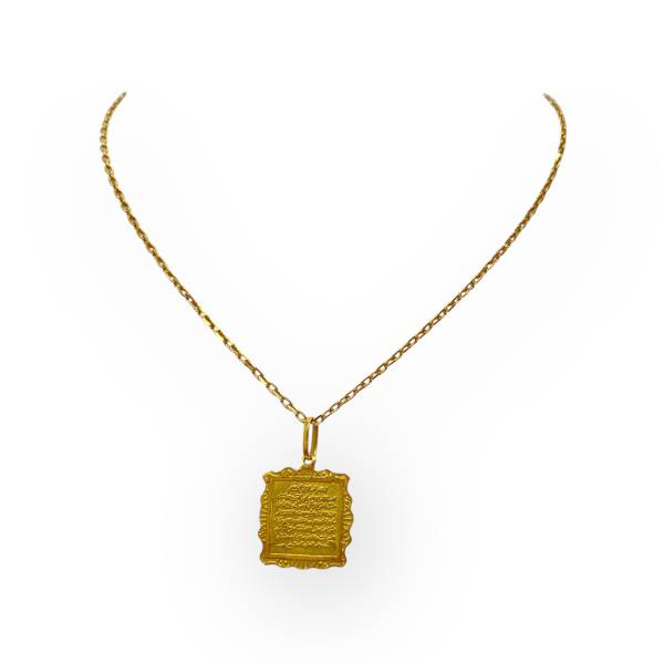 Offrez-vous un bijou d’exception avec ce magnifique pendentif en or 750 (18 carats), finement gravé de calligraphie arabe. Sa forme rectangulaire aux bords délicatement travaillés lui confère un charme traditionnel et raffiné. La gravure centrale apporte une dimension spirituelle et symbolique, idéale pour ceux qui souhaitent porter un bijou à forte valeur culturelle et personnelle.