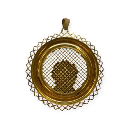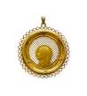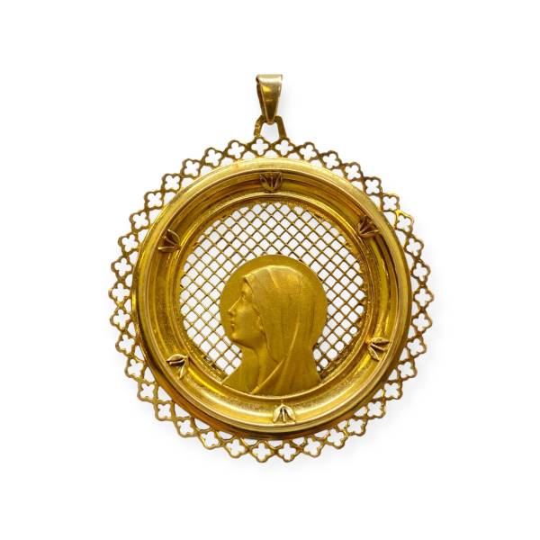 Pendentif en or 750/1000 (18k), représentant une Vierge de profil finement travaillée, entourée d’un motif ajouré décoratif. Un bijou ancien au caractère symbolique et raffiné, au beau travail d’orfèvrerie.