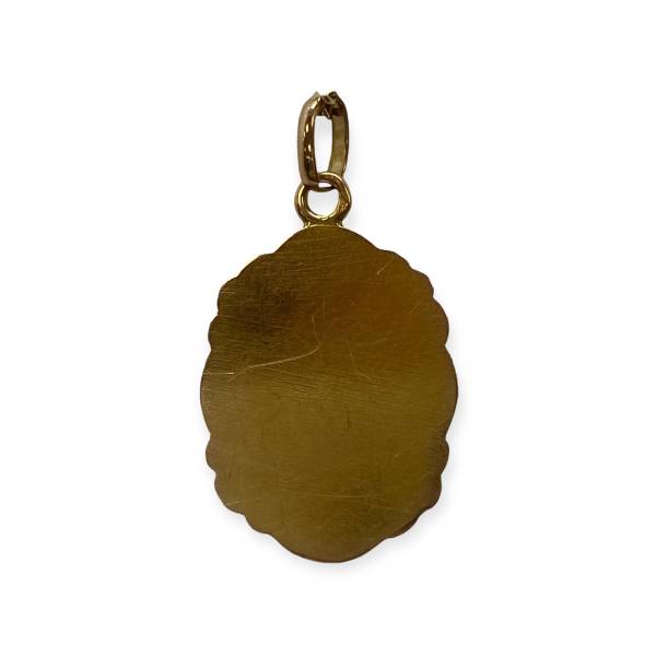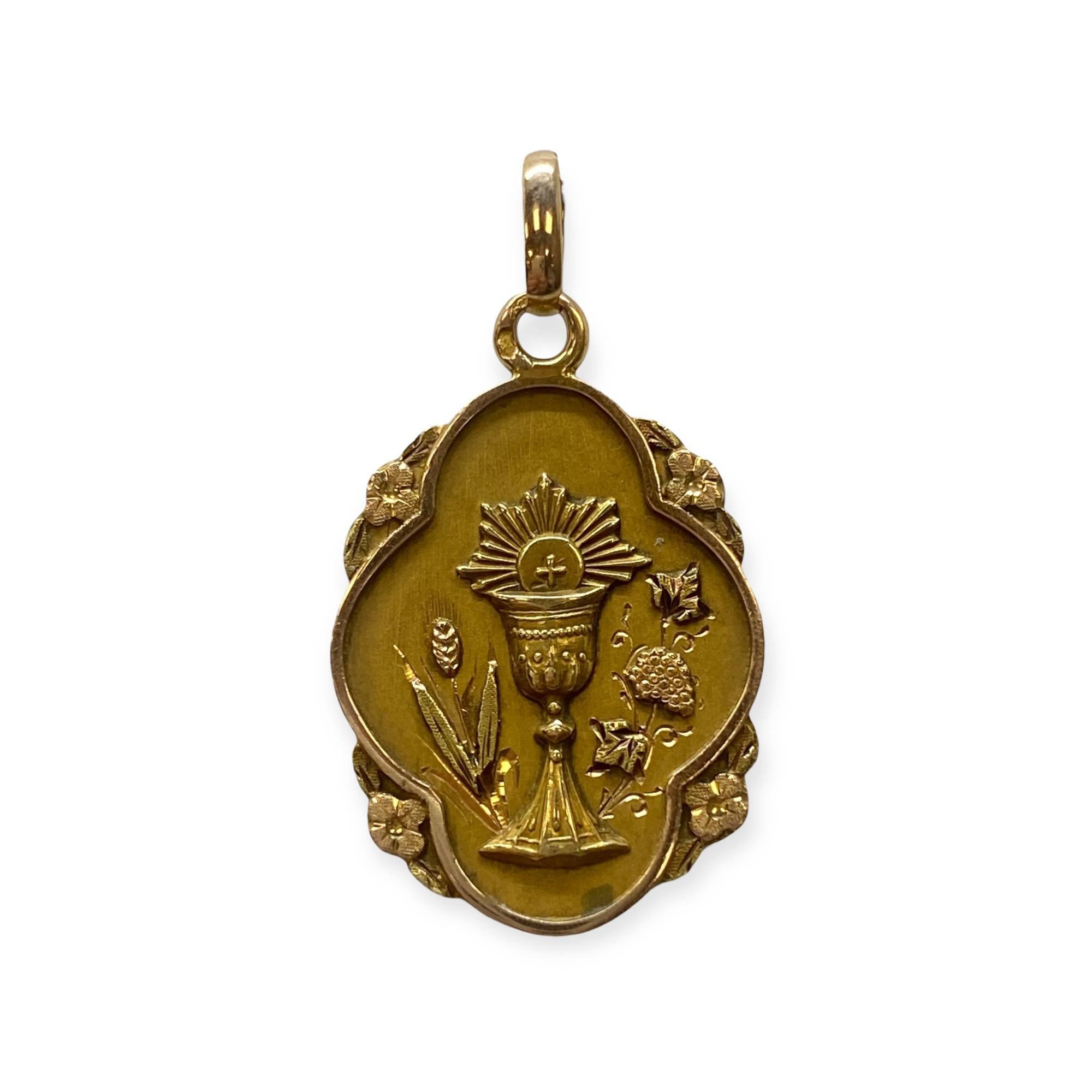 Pendentif en or 750/1000 (18k), représentant un calice finement travaillé, entouré de motifs floraux en relief. Un bijou religieux ancien, au travail soigné et au caractère symbolique.