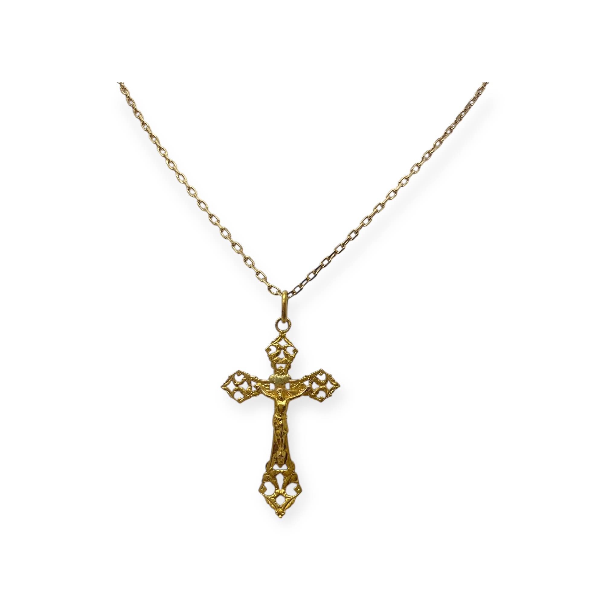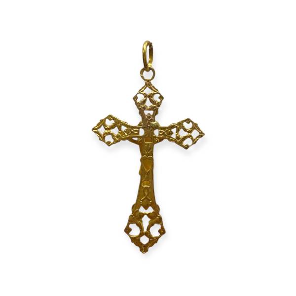 Pendentif en or 750/1000 (18k), représentant une croix ajourée finement travaillée avec Christ en relief. Un bijou religieux ancien, au travail d’orfèvrerie détaillé et au caractère symbolique affirmé.