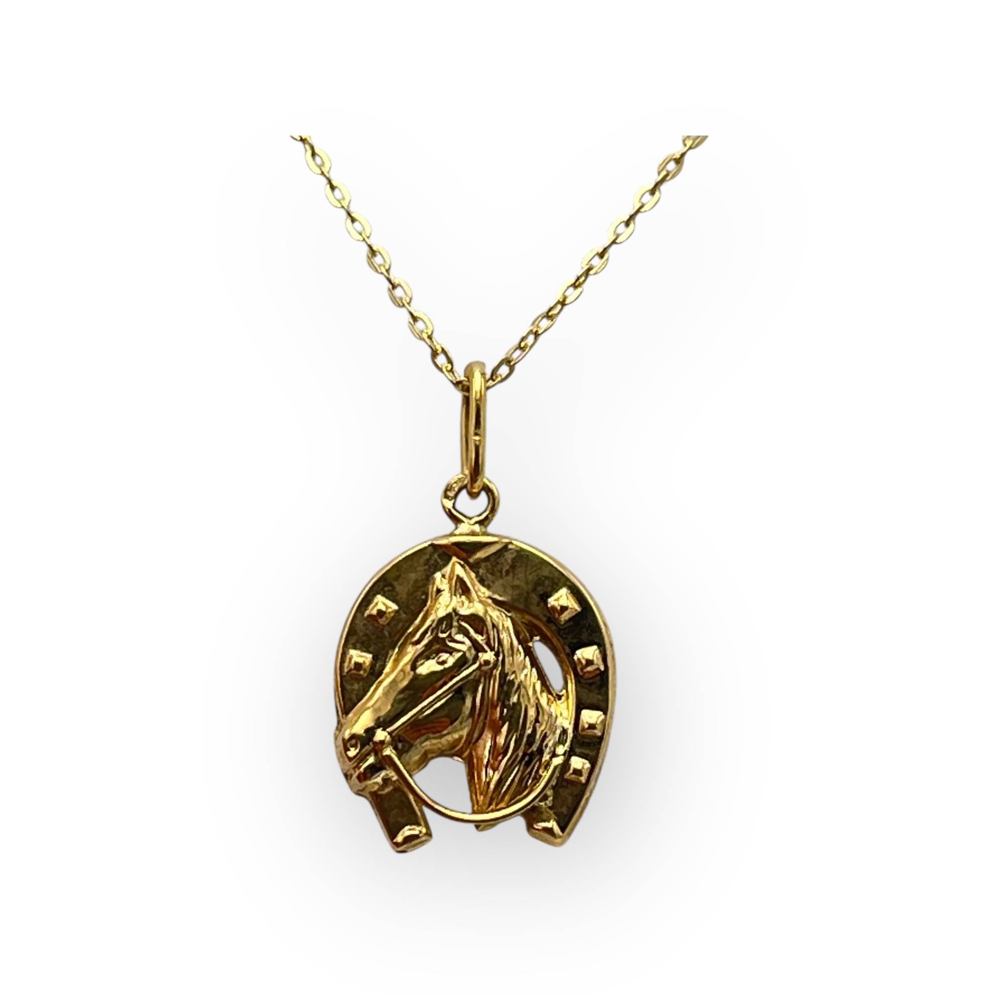 Pendentif en or 750/1000 représentant un fer à cheval porte-bonheur, symbole de chance et de protection, au motif finement travaillé.