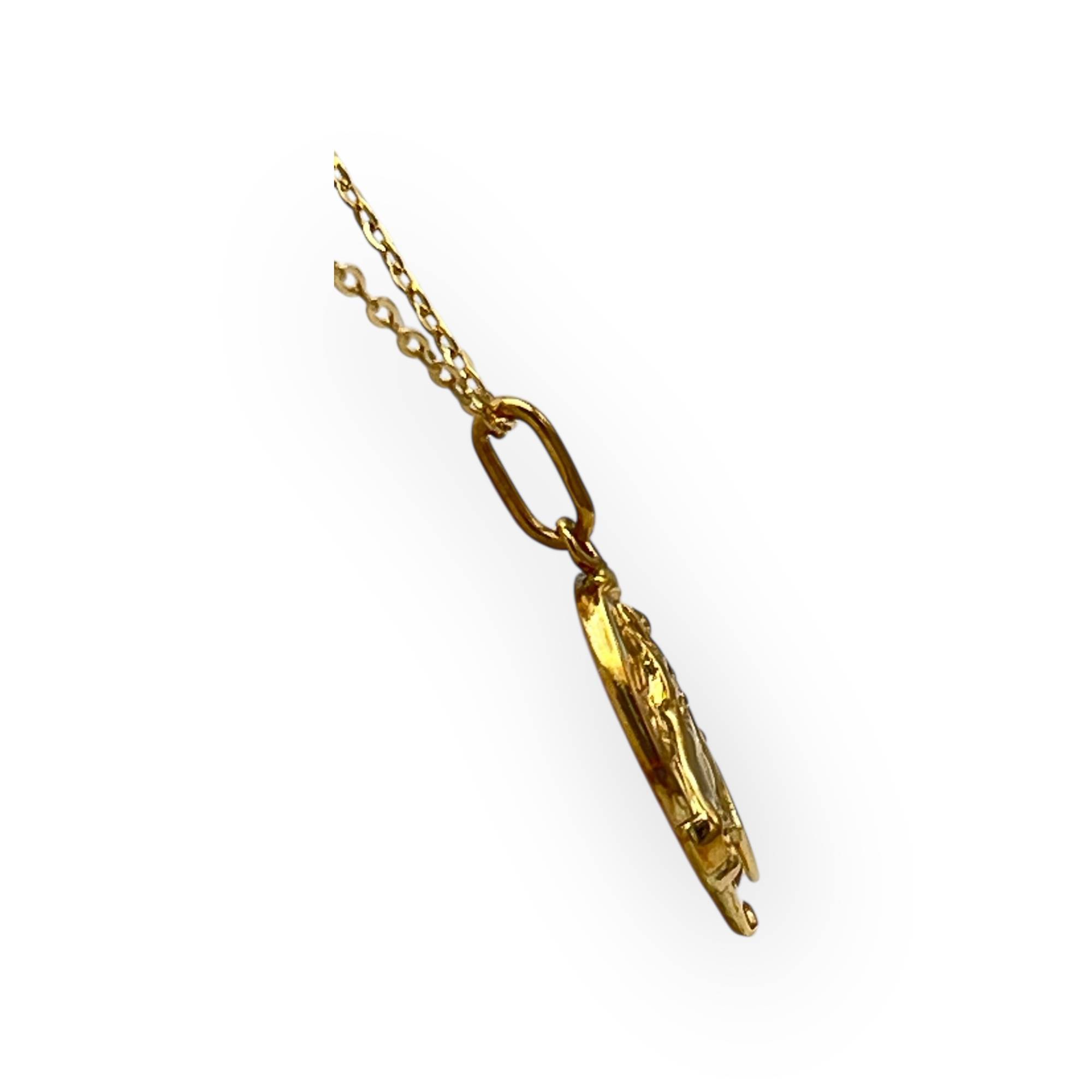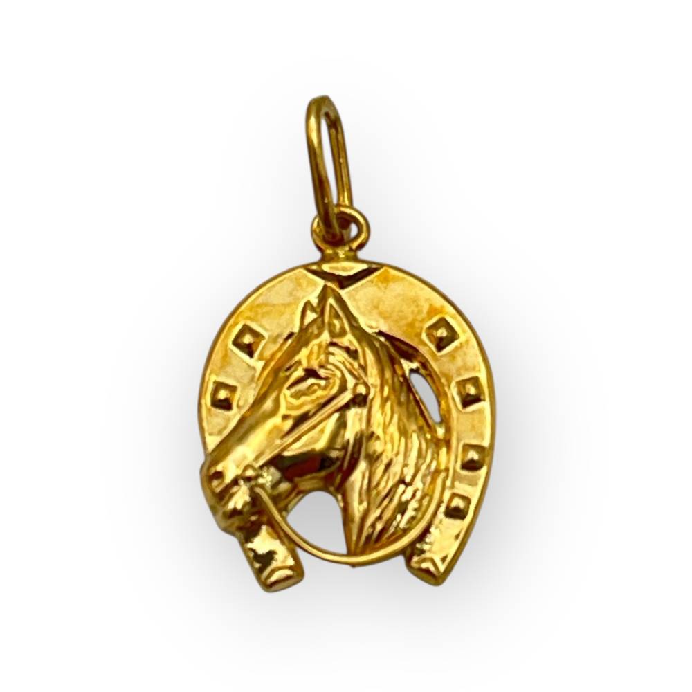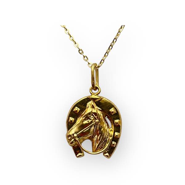 Pendentif en or 750/1000 représentant un fer à cheval porte-bonheur, symbole de chance et de protection, au motif finement travaillé.
