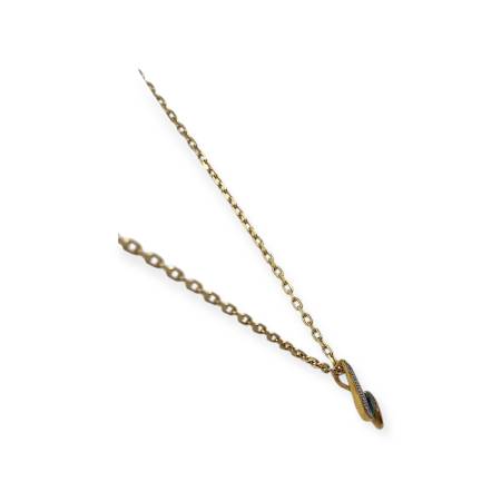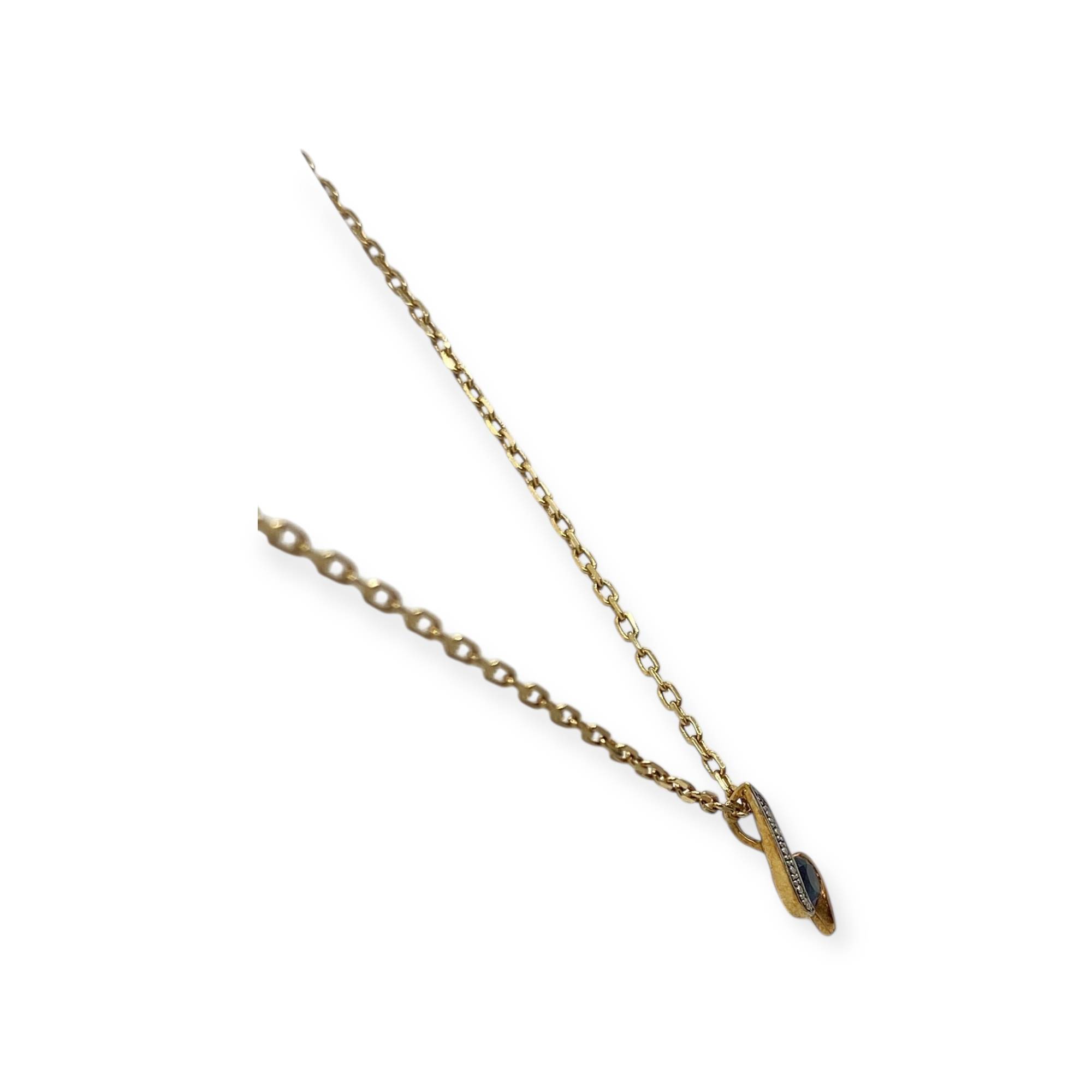 Pendentif en deux ors 750/1000 (18k), associant or jaune et or blanc dans un design fluide et élégant. Il est orné d’un saphir, mis en valeur par une ligne scintillante en or blanc. Un bijou raffiné au style moderne et féminin, idéal à porter seul ou avec une chaîne fine.