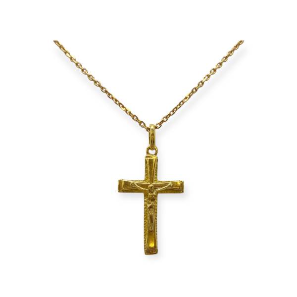 Pendentif en or 750/1000 (18k) représentant une croix avec le Christ finement sculpté en relief. Finition brillante et détails soignés, offrant un rendu à la fois sobre et expressif. Un bijou symbolique, élégant et intemporel, idéal à porter au quotidien ou pour une occasion particulière.