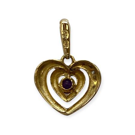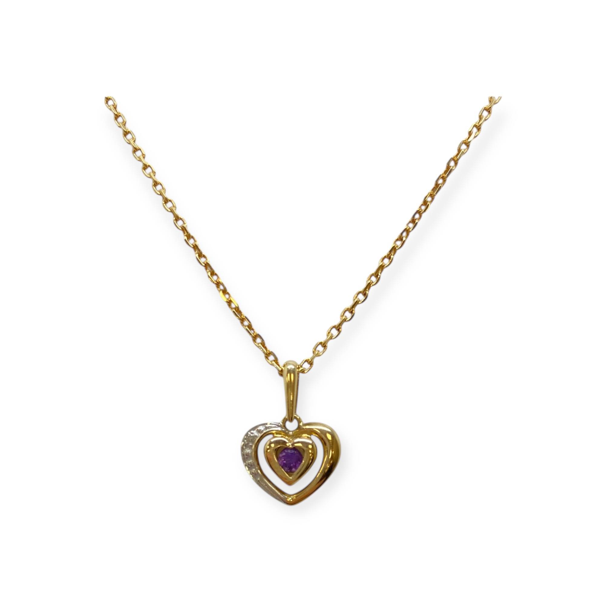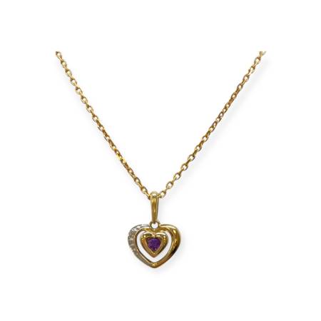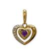 Pendentif en forme de cœur ajouré, réalisé en deux ors (jaune et blanc). Le cœur central est serti d’une pierre violette (type améthyste), tandis que la partie en or blanc est ornée d'un diamant. Monture en or 375/1000 (9k), design délicat et symbolique, représentant l’amour et l’harmonie.