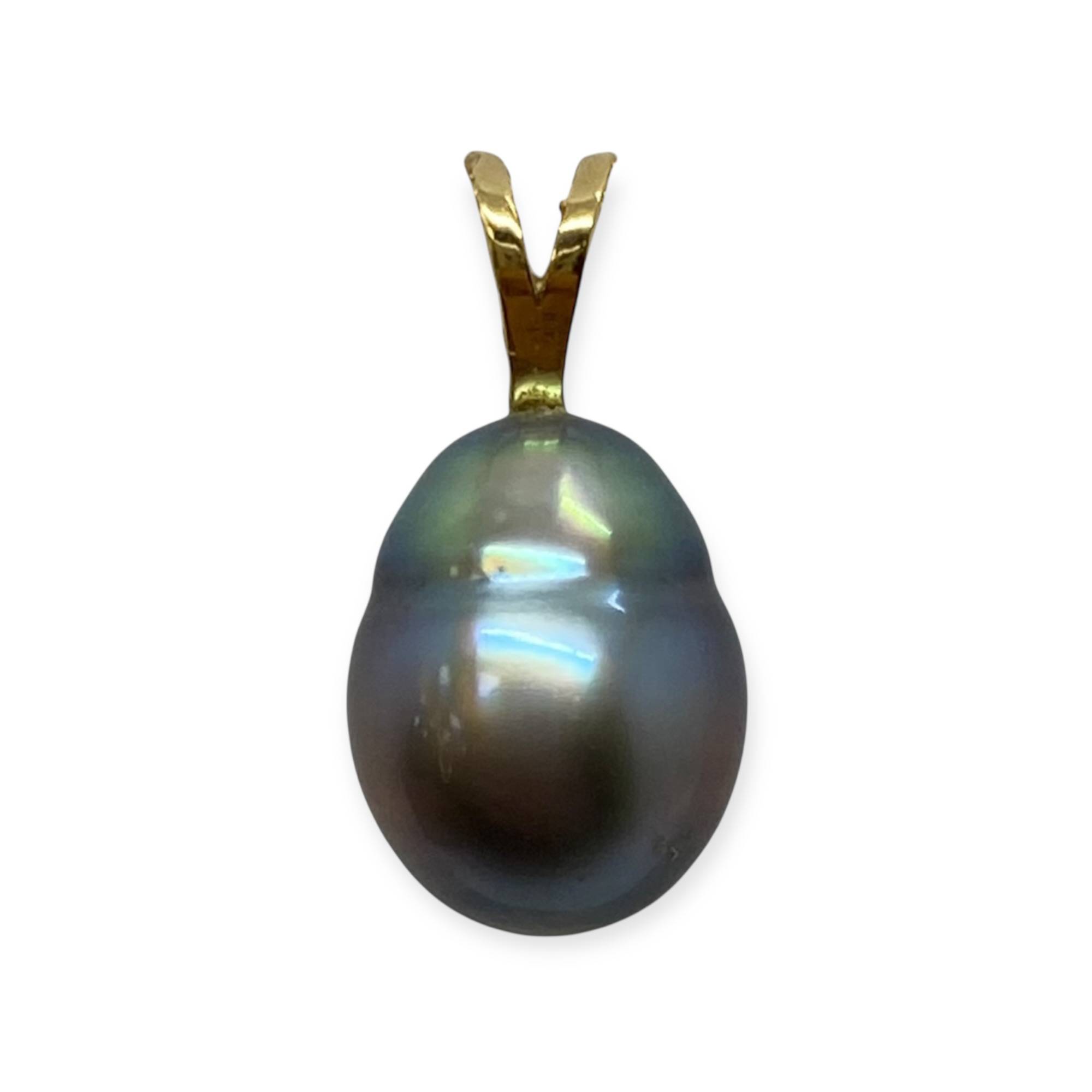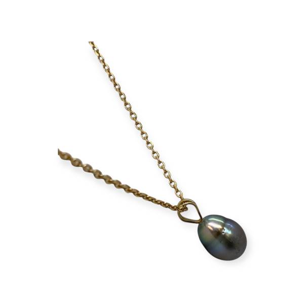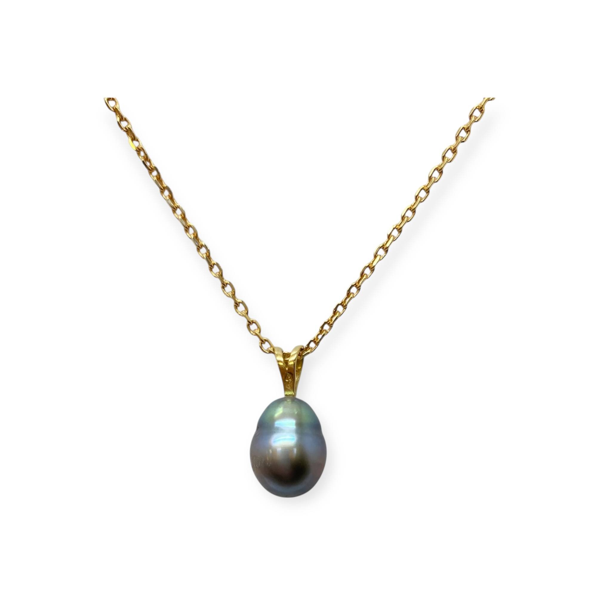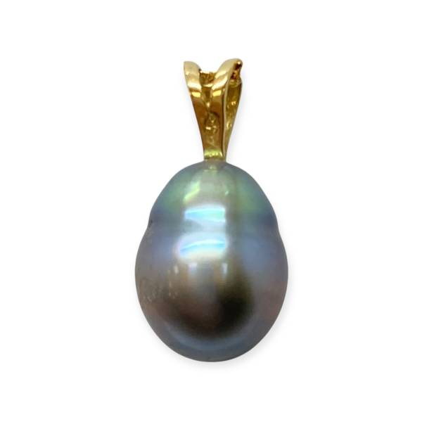 Pendentif en or 750/1000 (18K) orné d'une perle de Tahiti aux reflets profonds et irisés. Une pièce élégante qui met en valeur la beauté naturelle et unique de cette perle d'exception.